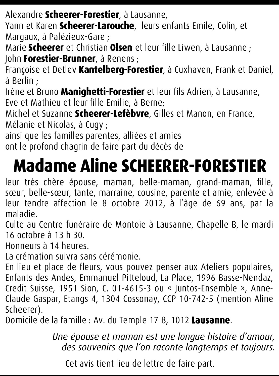 2012, une année écourtée pour Aline, mais une année ô combien riche en achèvements de par la naissance de ses trois petits-enfants! Puisse-elle de sa nouvelle demeure soutenir ceux qu'elle a laissés derrière afin qu'ils poursuivent sa tâche dans la sérénité et l'acceptation courageuse de sa nouvelle présence. À l'instar de notre amie Lisette qui a rencontré Aline à notre mariage, nous la croyons plus vivante maintenant pour veiller sur les siens mieux que jamais. Condoléances à Alex, Yann, Marie et leurs proches. Térez et Urgel