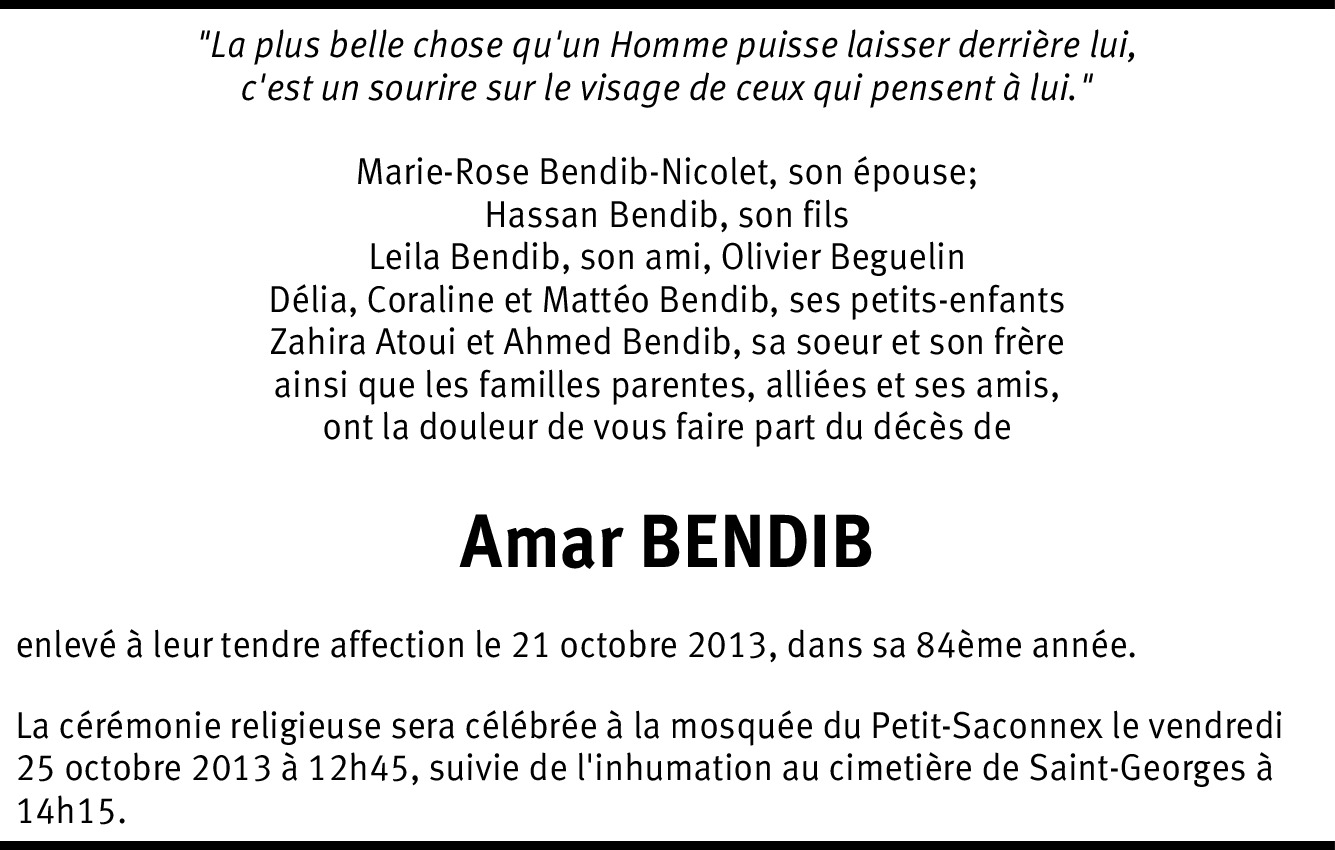 Bonjour Marie-Rose, peut-être vous souvenez vous de moi? J'étais la femme de Tahar Rebiha. Je vous présente ainsi, qu'à votre famille, me sincères condoléances, à l'occasion du décès de Amar. Je garde un très bon souvenir de Amar qui était toujours très souriant. Avec tous mes respects. Paula