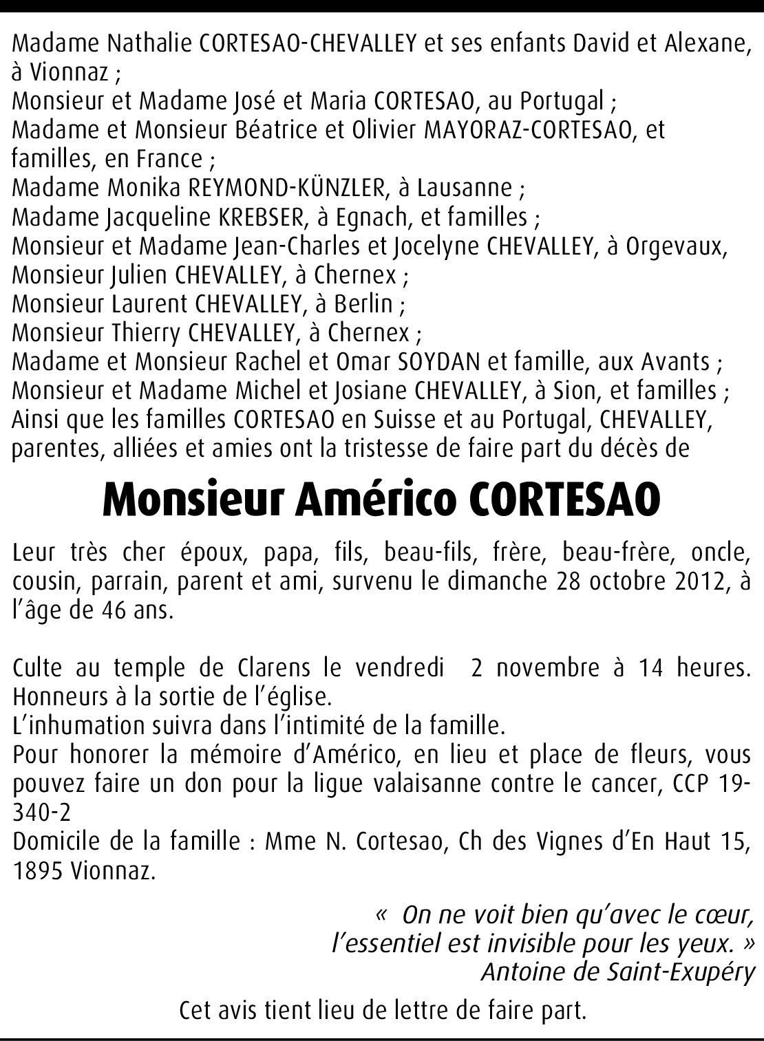 ce matin cette nouvelle qui m'attriste tout particulièrement tellement je considérais Rico comme un Grand Ami avec lequel nous avons travaillé et nous nous sommes appréciés pendant pendant plus de dix ans. Je suis ému et aurai toujours un pensée pour lui, pour toi et pour tes enfants. Je me joints à ton deuil et te présente toutes mes condoléances et espère que tu vas être forte pour un homme qui l'était. Si tu as besoin de quelque chose, je suis atteignable au 079/ 371 95 71.