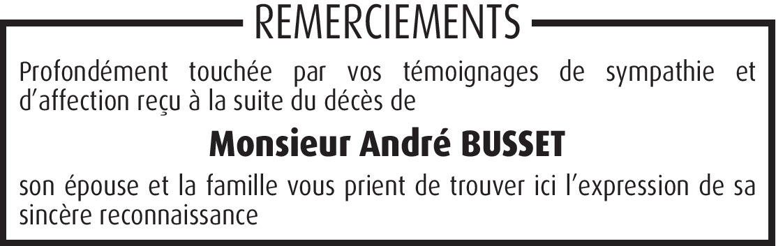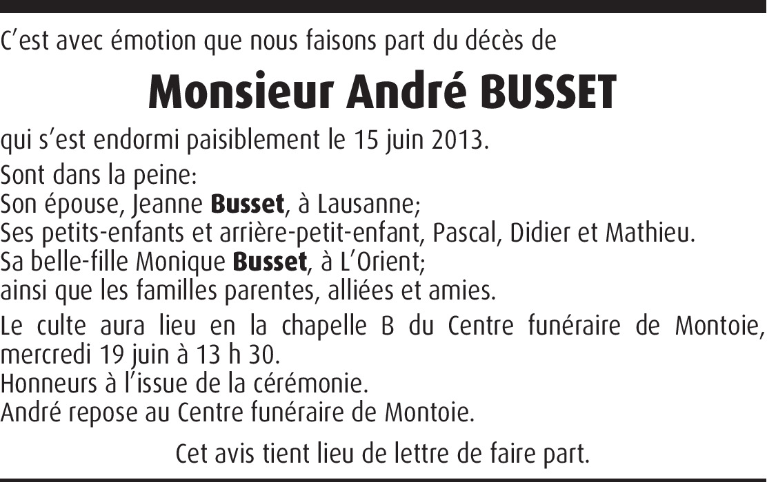 Bien que nous ayons un léger doute quant à savoir, si c'est bien le André Busset que nous connaissons. Celui qui à travaillé de nombreuses années à l'illustré, celui qui à œuvré de longues années pour la pétanque Lausannoise, vaudoise et Suisse, celui qui fût un assistant social remarquable dans ses jeunes années. Nous transmettons toutes nos condoléances à sa famille , André était un homme de bien, d'une grande humanité et d'une grande générosité, quelqu'un de remarquable dans tous les bons sens du terme, que ton repos soit doux, car ton cœur a été bon ! Michèle et Jean-Claude Grin