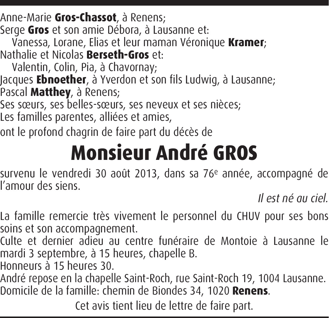 Il y a plus de 4 ans Signaler Par ces moments difficiles, toute ma sympathie à toute votre famille. Josiane et Pascal Reymond. De la part de Pascal Reymond