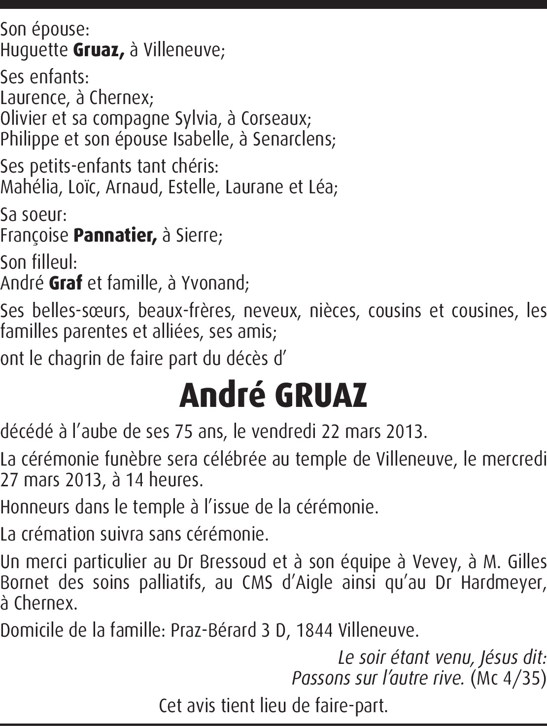 Absents de Suisse, nous apprenons avec tristesse le décès de Monsieur Gruaz. Que de bons souvenirs je garde de notre collaboration à la direction des écoles de Montreux. Croyez chère famille, à toute notre sympathie émue.