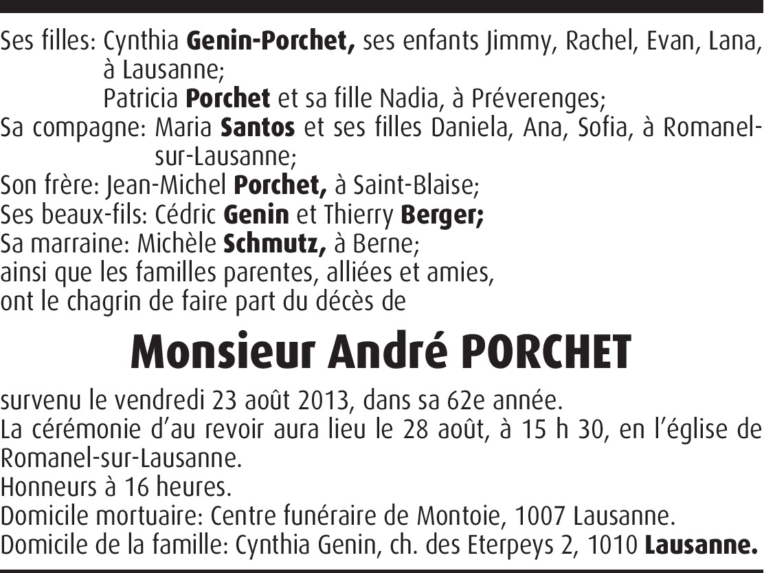 Il y a plus de 4 ans Signaler Toutes nos condoléances à la famille, nous sommes de tout coeur avec vous. De la part de Nicole et Jean-François Bally (Lugeon de Romanel)