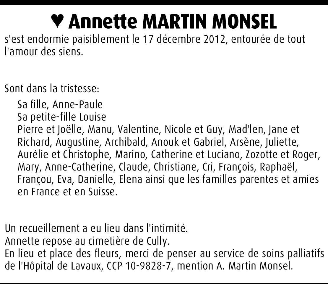 J'ai appelé ta maman il y a peu, elle était très faible et en essayant de l'appeler aujourd'hui, je comprends qu'elle n'est plus parmi nous. Je garde d'elle les bons moments de partage pendant ces années au collège de Plan à Vevey. Les Poyetterie, son style plein de fantaisie qui lui allait si bien et sa générosité de coeur. Toute ma sympathie. Véronique.