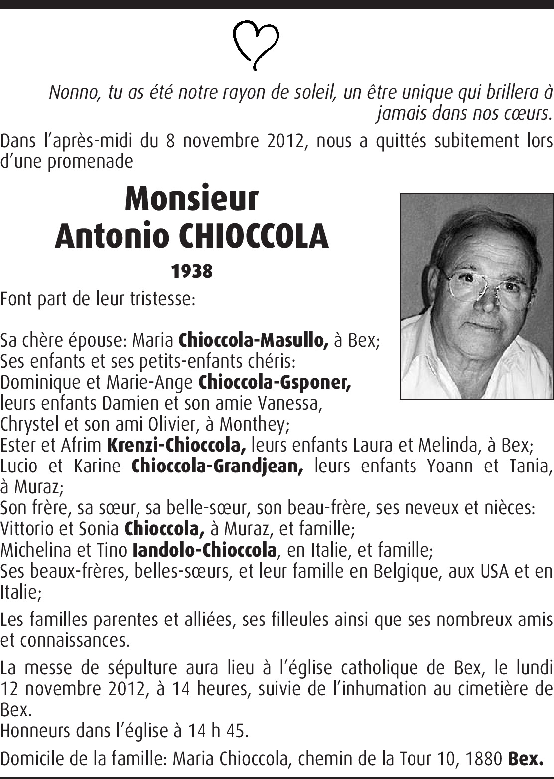 Un être unique, en effet, plein de douceur, de gentillesse,d'une patience et d'une extrême politesse. Mme Chiccola, Ester, Afrim Laura et Mélinda, ainsi que toute la famille, je pense à vous très fort en ces moments si difficiles. Christiane Guillaume Delacretaz.
