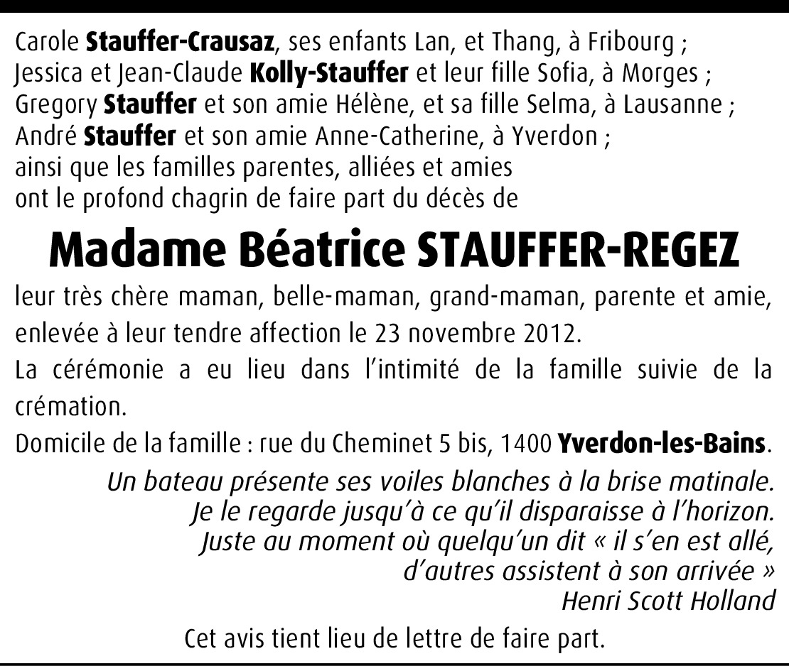 Chère famille, je suis très peinée d'apprendre le décès de votre Maman, je la connaissais en tant que laborantine chez le Dr Abetel, et je l'appréciais beaucoup, c'était une belle personne, je vous prie de croire, chère famille, à mes sincères condoléances. Mmes Gilgien.
