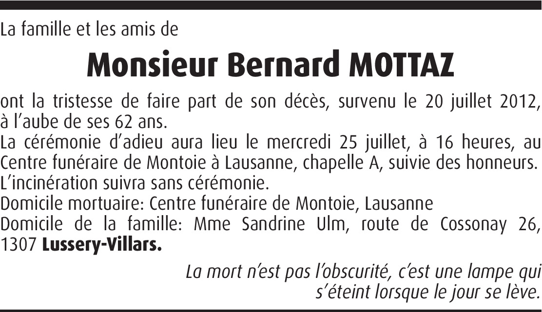 Au mois d'août 1950, alors que j'avais 6 ans, à ma grande surprise, mes parents m'anonçèrent: c'est un grand jour, tu es devenu oncle. Nous sommes en 1957, un jour ma mère me dit, j'ai une grande nouvelle, dès aujourd'hui tu vas avoir un petit frère. Pour différentes raisons, Bernard va venir vivre avec nous à la maison. Accueille le et protège le comme ton frère. Nous avons vécu ainsi heureux pendant des années jusqu'à ce que ma vie professionelle ne nous sépare, puis nous nous sommes perdu de vue, retrouvé, avons voyagé ensemble et enfin retrouvé jusqu'à ce que le Divin ne nous sépare à nouveau. Bernard, je suis fier d'avoir été ton oncle, ton frère, ton copain et ton ami. Pour terminer, j'aimerais citer cette réflexion que tu aimais à dire quand tu te trouvais heureux "On est bien hein! on est bien...." Sois "bien" et repose en paix. Francis Mottaz