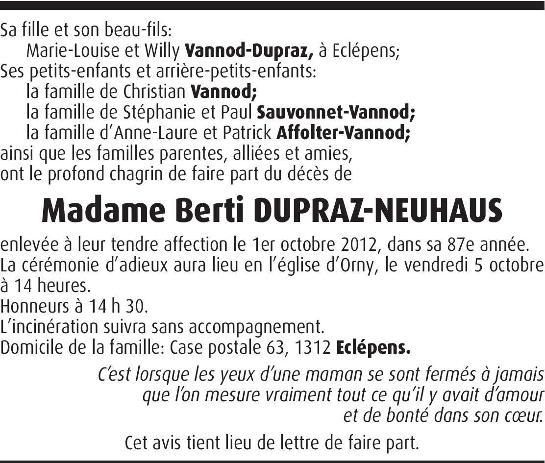 Il y a plus de 4 ans Signaler Chère famille, De tout coeur avec vous durant cette épreuve veuillez croire à toute ma sympathie. Arlette De la part de Arlette Bertholet