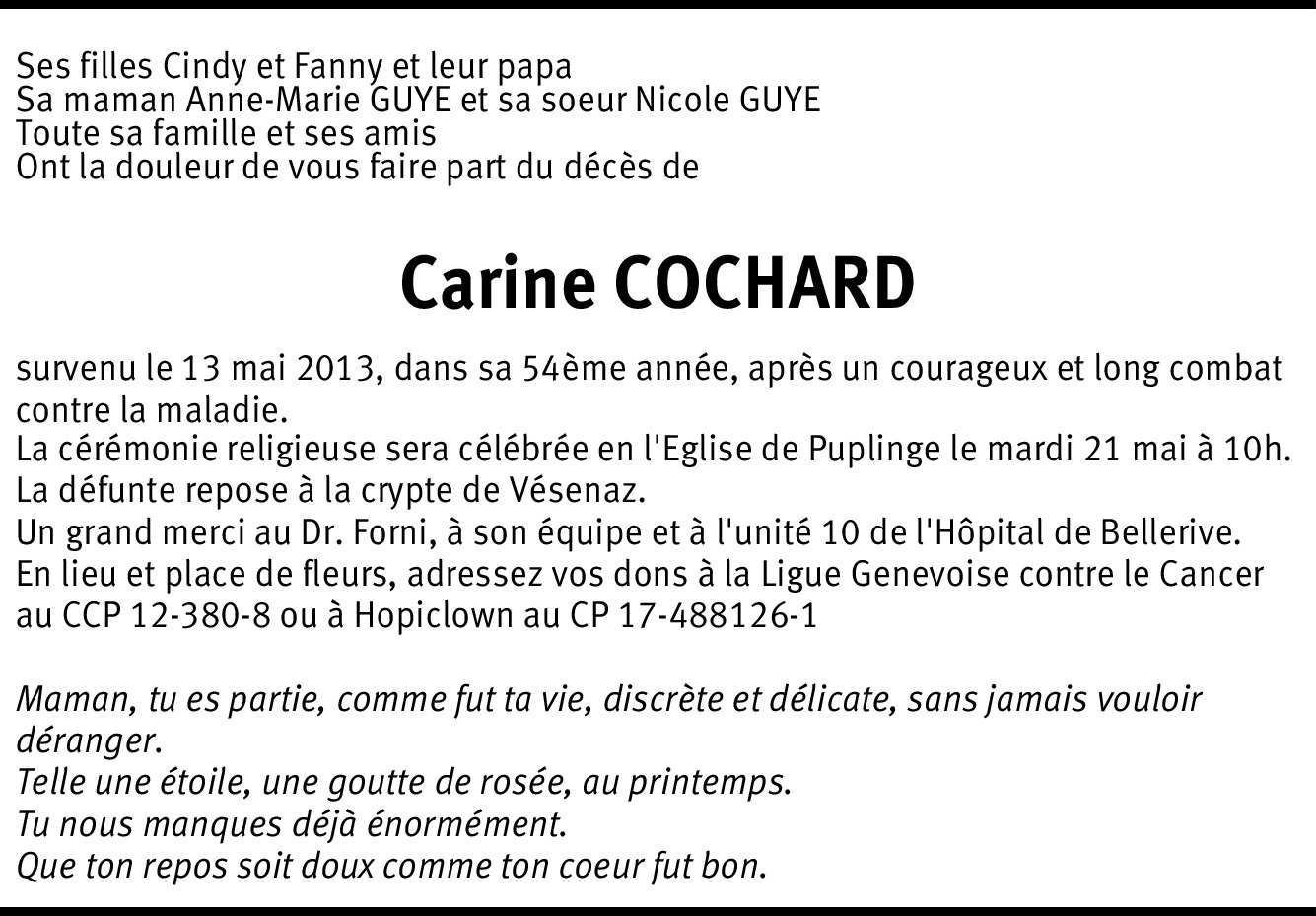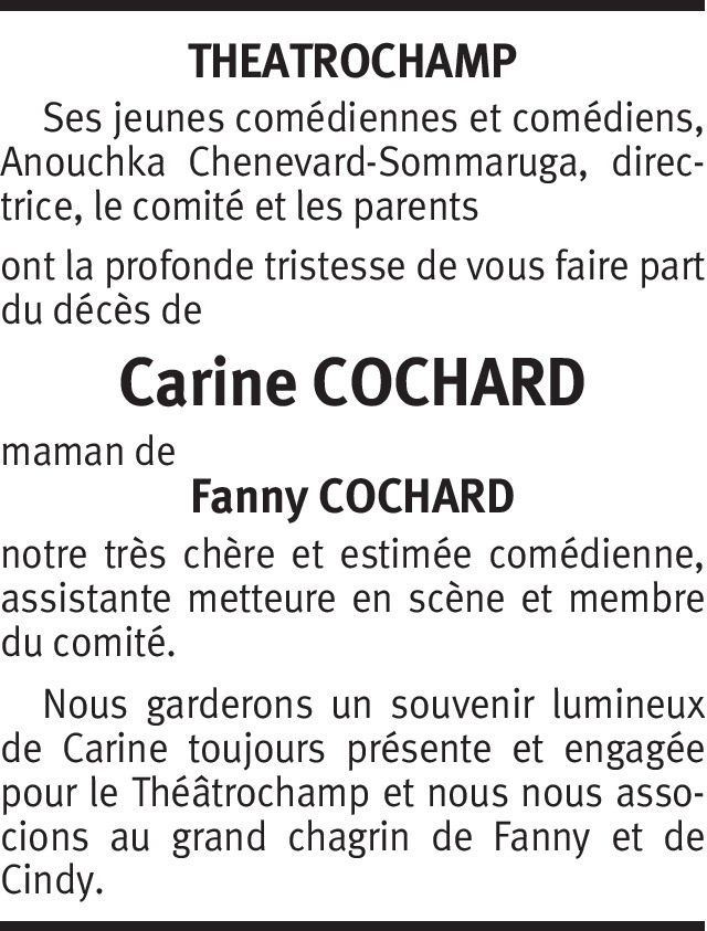 Il y a plus de 4 ans Signaler Nos plus sincères condoléances. Nous sommes de tout coeur avec vous et garderons le souvenir de Carine et de sa gentillesse. Familles Deruaz et Schafroth. De la part de Myriam Deruaz