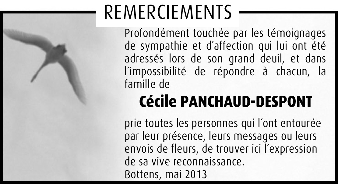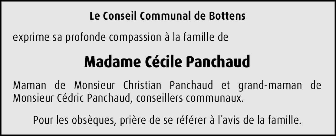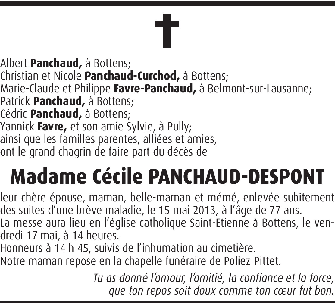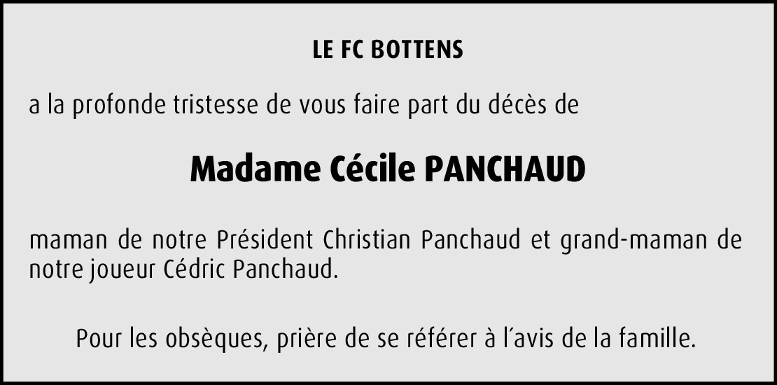 Il y a plus de 4 ans Signaler Très fort en pensées avec vous et toute la famille. Cécile restera un souvenir très fort de Bottens De la part de Michèle et Jean-Daniel Bailly