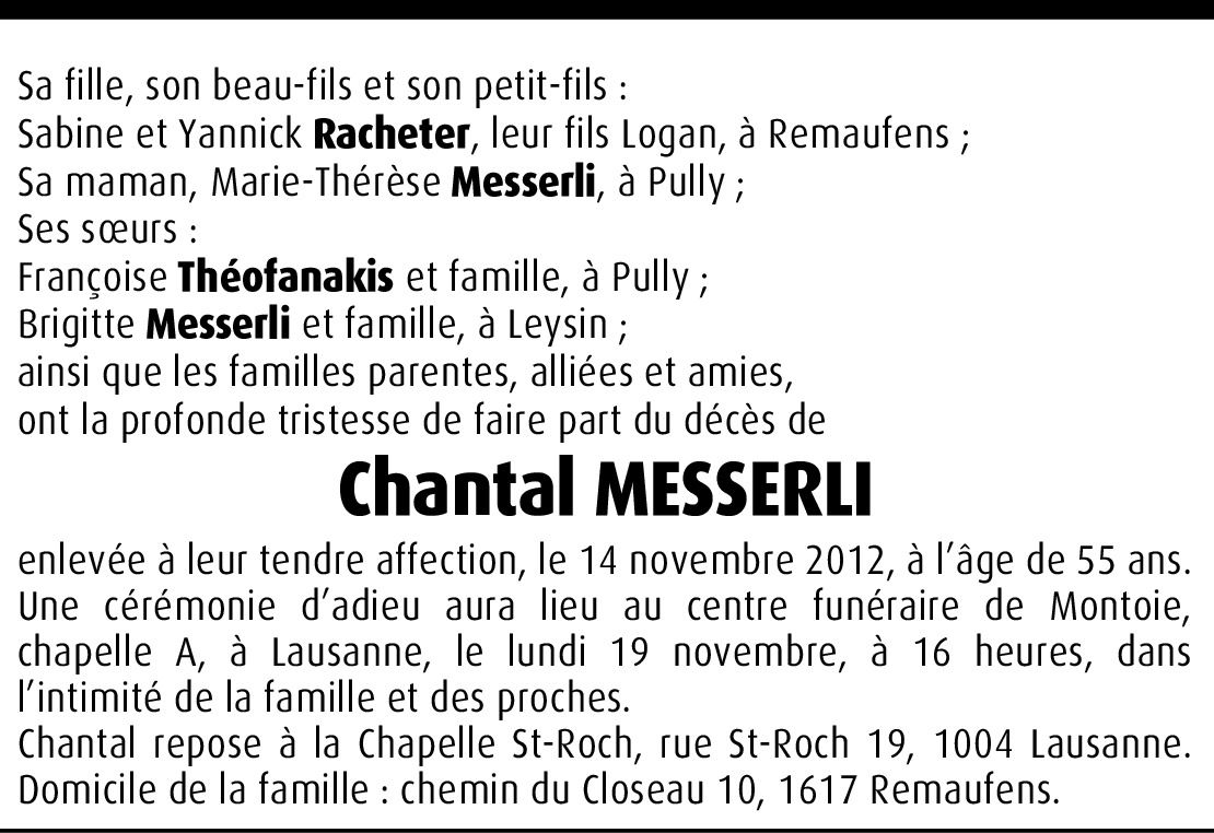 Voilà, j'ai été très surprise comme bien des gens, elle est partie !!! Maintenant elle est avec les anges et son Papa. Je garde un très bon souvenir de ta Maman, je l'ai connue en tant que Collègue, puis par la suite c'est devenu une Amie. Vrai qu'elle avait du caractère, mais elle était droite, sincère et avait de l'humour. Vous lui avez rendu un très bel hommage. Sache que si, malgré ta Famille, tu as besoin d'un réconfort ou autre, tu peux toujours me contacter. Mes sincères condoléances à Toi et aux Soeurs de ta Maman. Je t'embrasse. Anne-Marie.
