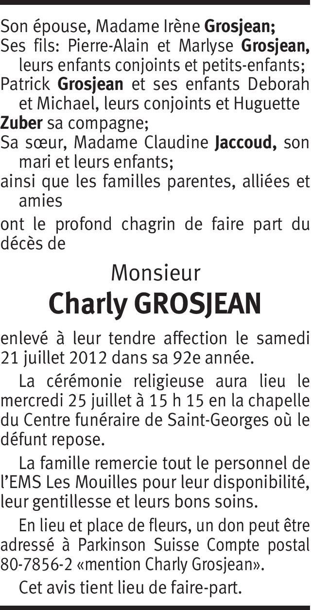 Il y a plus de 4 ans Signaler Nous sommes en pensée avec vous pendant ces jours de deuil et vous présentons nos sincères condoléances. Amitiés. De la part de Daniel Piguet