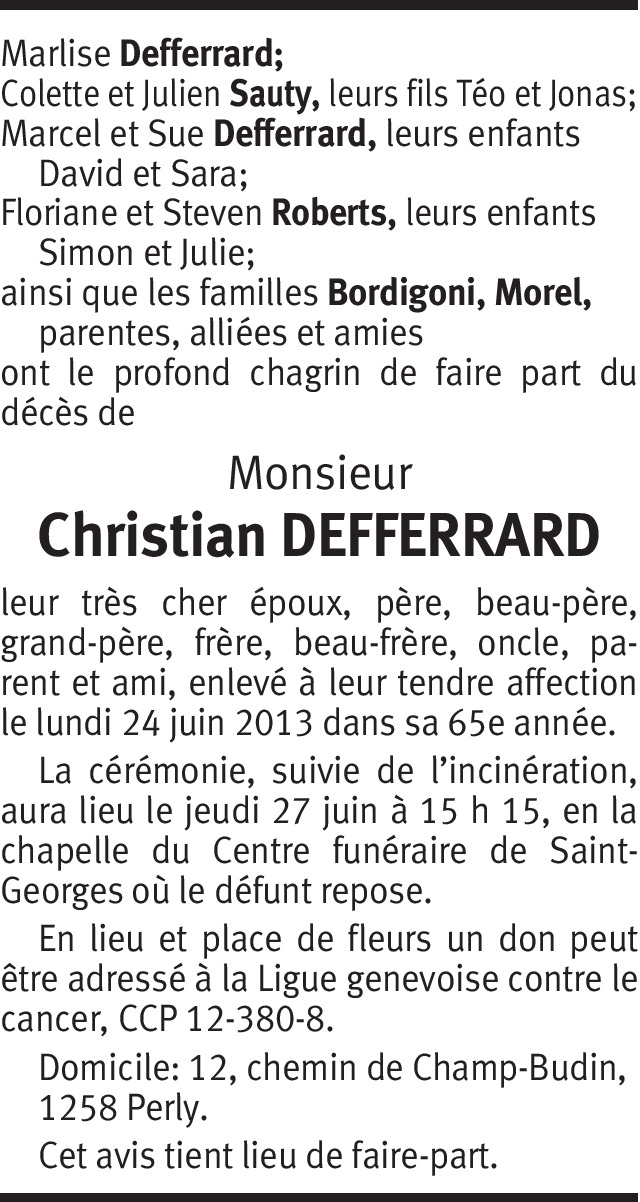 Ma chère Marlyse, c'est une tristesse profonde que nous venons d'apprendre le décès de Christian. Nous sommes sans voix. Nous ne pouvons que te présenter nos plus sincères condoléances. Nous restons à ta disposition pour l'aide que nous pourrions t'apporter. Nous t'embrassons bien fort.