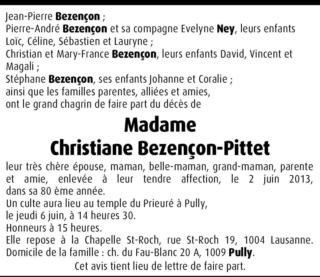C'est avec tristesse que j'ai appris le décès de votre épouse et maman. Nous avons chanté pendant plus de 10 ans ensemble et je garde de très bons souvenirs avec elle. Toute notre sympathie et nos sincères condoléances à toute la famille. Simone et Arnold.