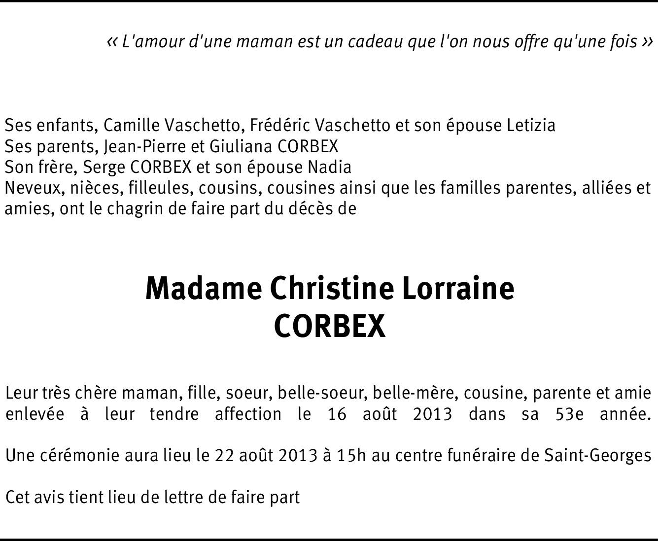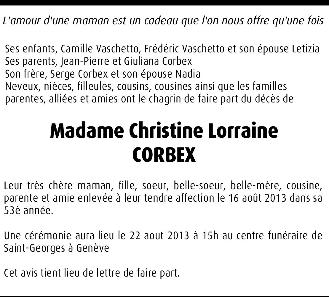 Il y a plus de 4 ans Signaler Cher jean-Pierre et Giuliana, Nous vous présentons nos sincères condoléances; nous ne pourrons malheureusement pas être présent Jeudi mais nous serons en pensées avec vous. Riccardo & Cooky De la part de Riccardo et Cooky Albanesi