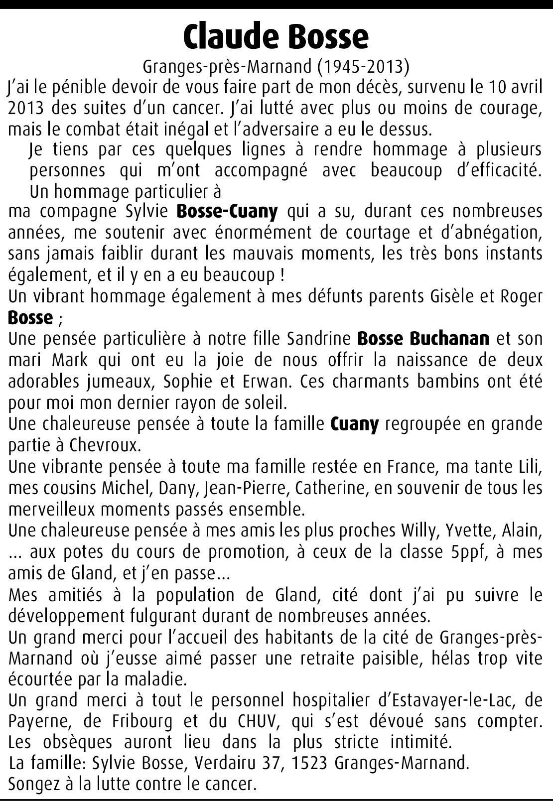 Nous allons essayer de garder les bons souvenirs de notre jeunesse lorsque tu partais si heureux sur ta belle moto rouge, alors bon voyage Claude, nous te gardons dans nos coeurs. Toutes nos pensées à toi Sylvie, à Sandrine, son mari et les petits. Bon voyage également à Mme Bosse, maman de Claude partie 2 jours avant son fils.