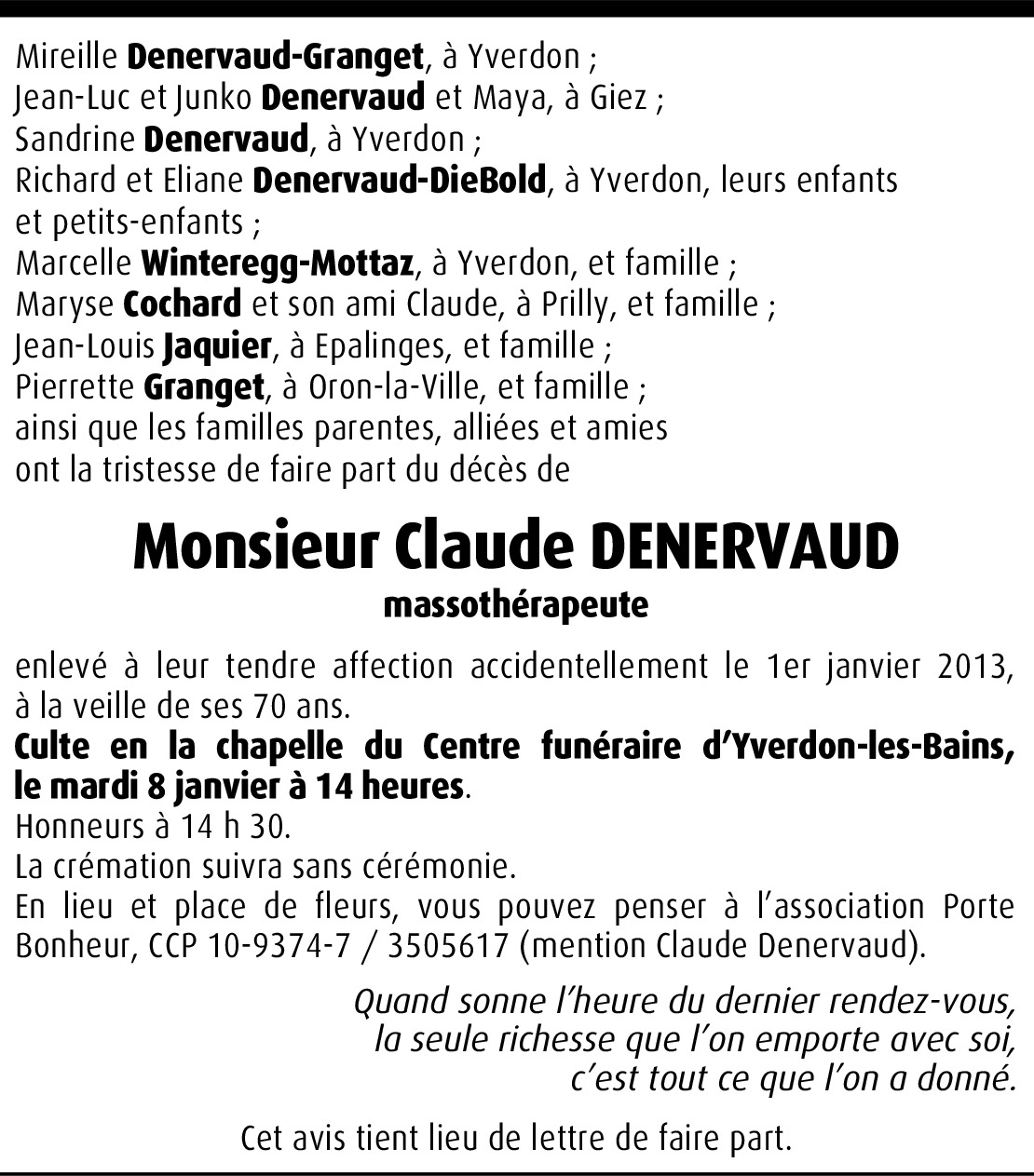 Je suis fier d'avoir connu un type comme Claude que j'ai côtoyé lors des trois Tour du Lac de Neuchâtel. Un type formidable que je n'oublierai jamais. Lors de la première édition du tour nous nous demandions quel était son intérêt d'organiser une telle excursion avec une bonne partie de gens qu'il ne connaissait pas. Nous avions réalisé rapidement que c'était juste pour son propre plaisir. Un plaisir de faire plaisir et d'aider son prochain par le sport et la nature. Quelle générosité dans ce que tu as fais pour nous. Merci Claude. A nous de suivre cette philosophie dans notre vie de tous les jours. En pensée avec sa famille. Pierre Koechli