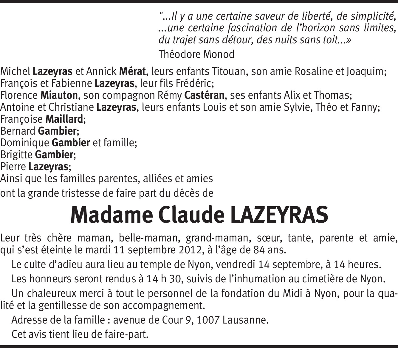 Il y a plus de 4 ans Signaler C'était une très belle cérémonie. A l'image de la météo du jour, Claude vous laisse en héritage toute la lumière qu'elle portait et qui anime chacun de vous. Amitiés sincères à vous Antoine et Christiane et tous les "vôtres". De la part de Christophe Vielliard