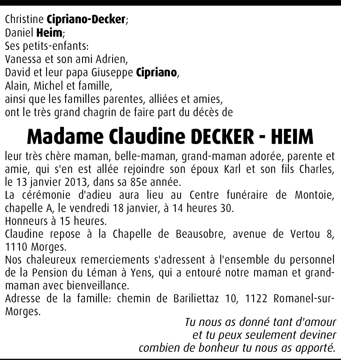 Il y a plus de 4 ans Signaler Chère famille, j'ai appris avec tristesse le récent décès de Claudine. Je suis en pensées avec vous lors de ces moments difficiles. Nous nous verrons ce vendredi à Montoie pour rendre hommage à Claudine. Sincères pensées, Gérald De la part de Gérald Heim