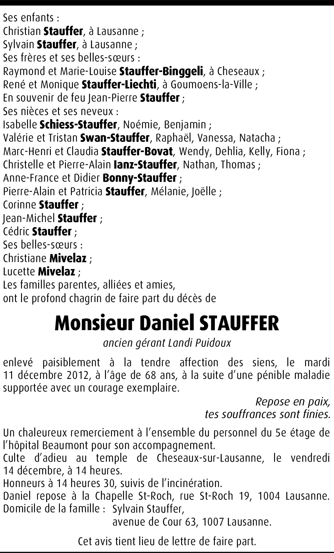Il y a plus de 4 ans Signaler Chère famille, j'aimerais vous donner toute ma sympathie à toute votre famille, et toutes mes sincères condolèances à tous. Janique Juriens. De la part de Janique Juriens