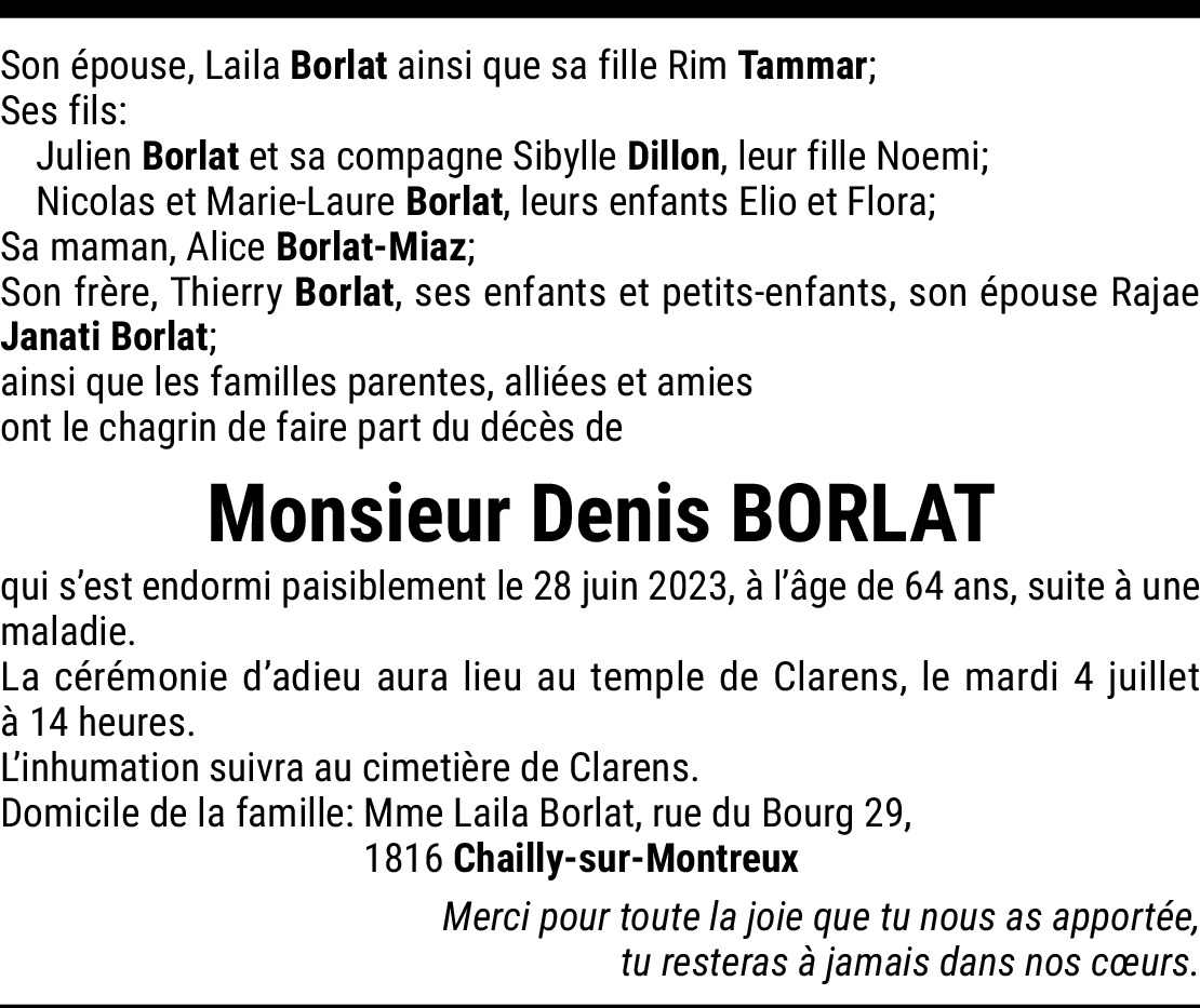 30.06.2023 Signaler Mes sincères condoléances à la famille. Je garderai un grand souvenir de Denis un véritable ami. De la part de Mury