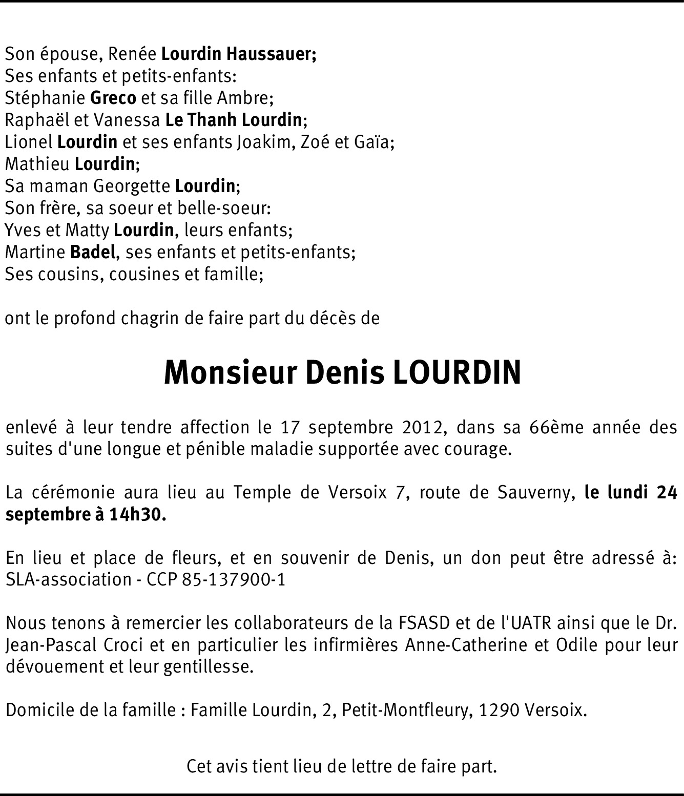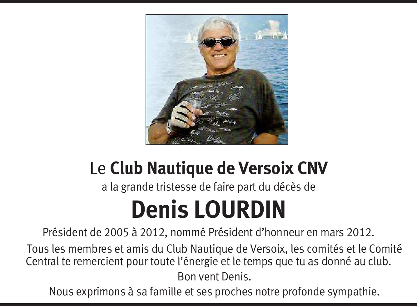 Mes pensées émues vont vers vous. On vous a enlevé Denis mais rien ni personne ne pourront vous enlever les souvenirs que vous garderez de lui au plus loin que votre mémoire puisse remonter dans le temps. Je ne connaissais pas bien Denis mais déjà 2 Bol d'Or vous donnent le temps et l'occasion d’apprécier les qualités de coeur de Denis. Vous pouvez être fier de lui. Yves, malgré l’éloignement tu sais que j’appréciais beaucoup ton frère. J'essaye d’être parmi vous cet après-midi à Versoix mais sache que mes condoléances les plus sincères vont vers vous. Amicalement. Christian