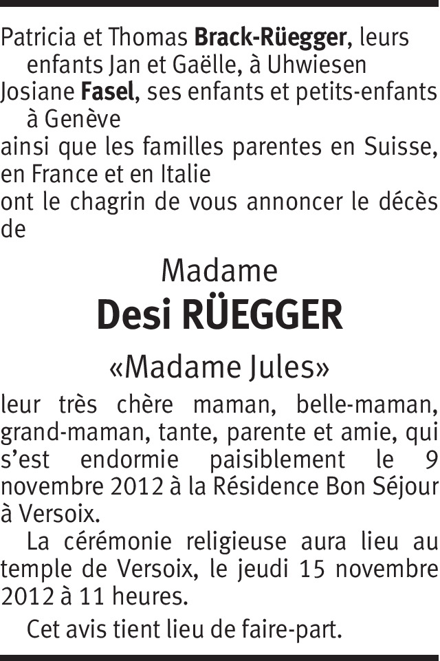 Il y a plus de 4 ans Signaler Nos très sincères condoléances à Patricia pour le décès de sa maman. Nous garderons toujours un chaleureux souvenir de "Madame Jules" De la part de Antoine et Maria Ferro