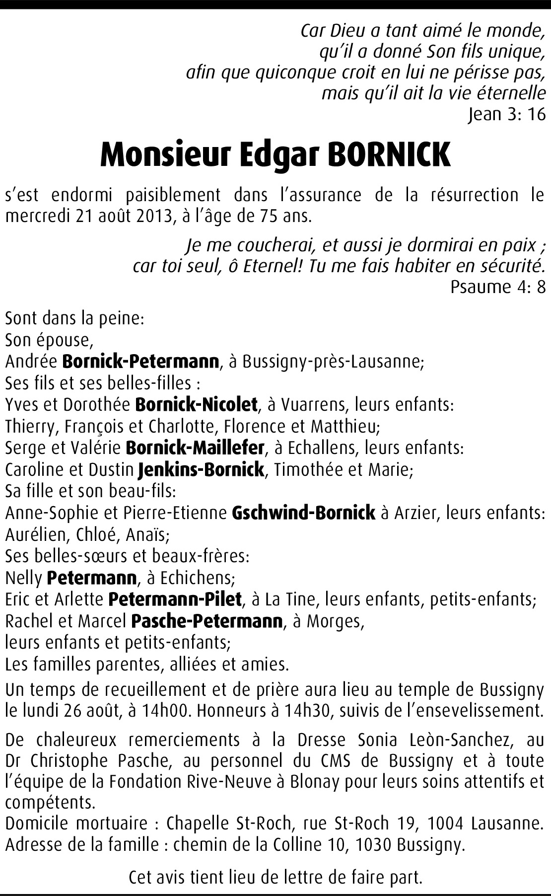 Nous voulons aussi vous témoigner de notre reconnaissance pour le travail accompli par Edgar Bornick, qui nous a permis de collaborer à l'œuvre du Seigneur.