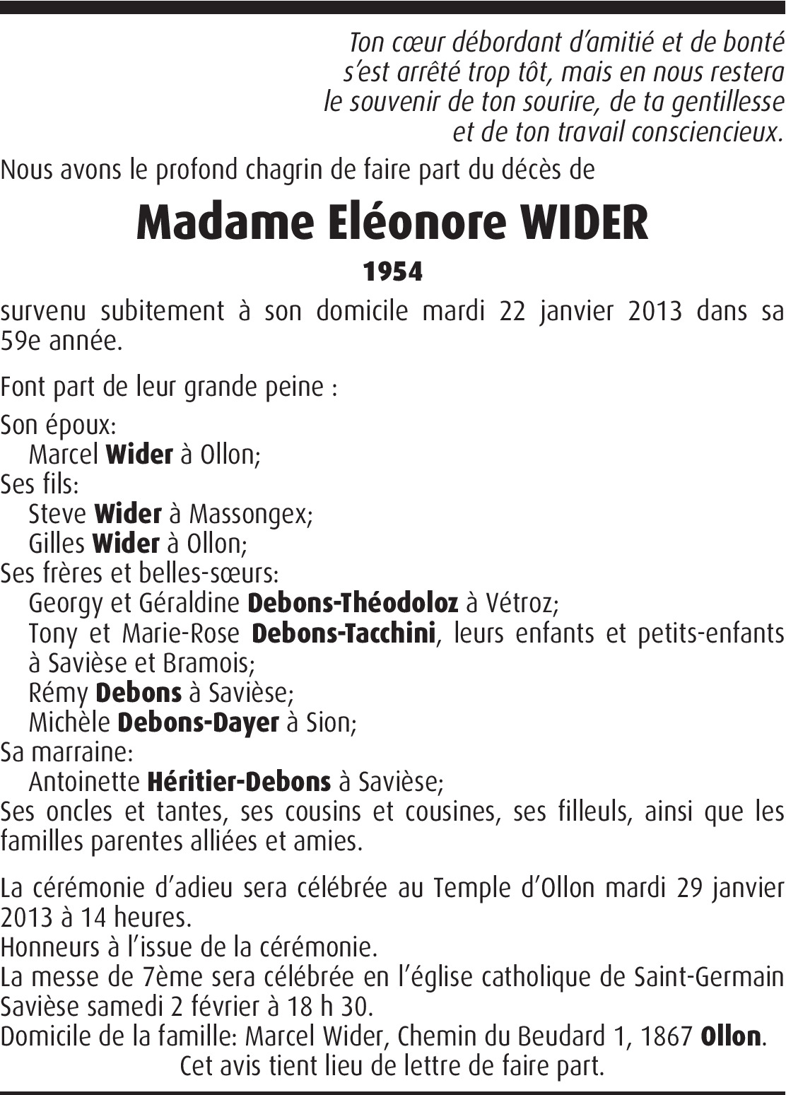 Il y a plus de 4 ans Signaler Salut Marcel, C'est avec une grande tristesse que j'ai appris le décès de ton épouse Eléonore. Je suis de tout coeur avec toi et je serai présent Mardi. Amitiés. De la part de Jean-François Aeby