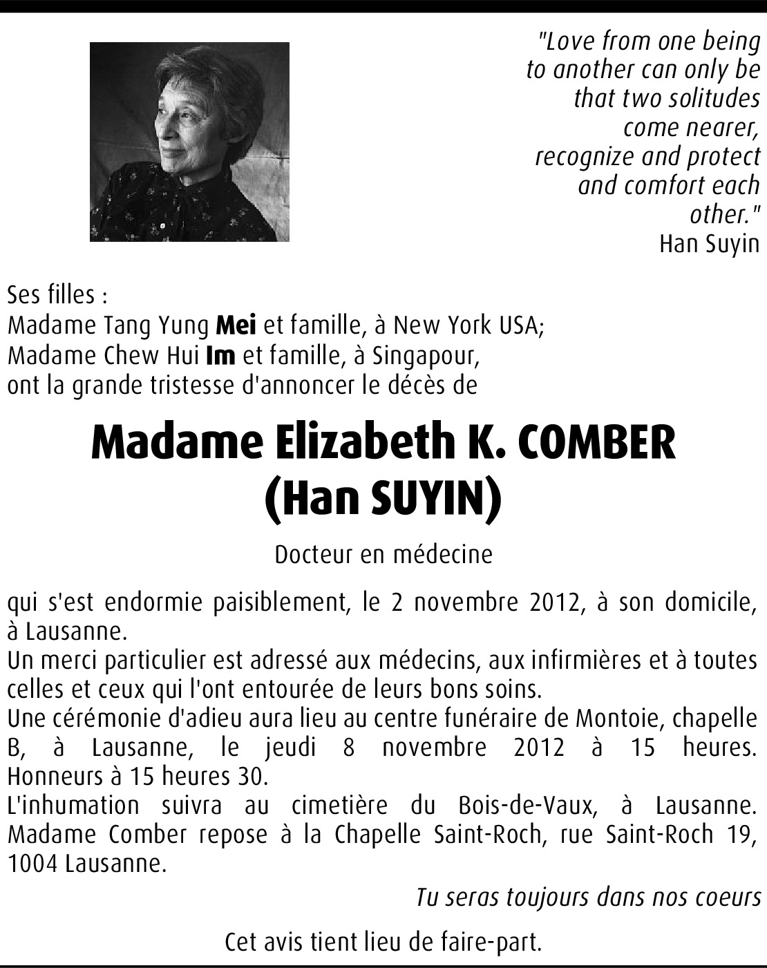 Merci à Han Suyin pour ses romans autobiographiques lus dans les années 60 qui m'ont appris sur elle, mais aussi sur la Chine et des habitants, dans un style agréable à lire, que j'ai apprécié. Bon courage à toute sa famille.