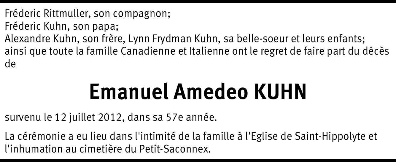 C'est avec une grande tristesse que nous apprenons le départ Emmanuel, la vie ne nous fait pas de cadeaux, nous garderons un très grand souvenir de toi Emmanuel de ta gentillesse, de ton sourire. Nous avons une grande pensée pour Frédéric et sa famille. Nous vous présentons nos plus sincères condoléances. Famille Tellenbach.