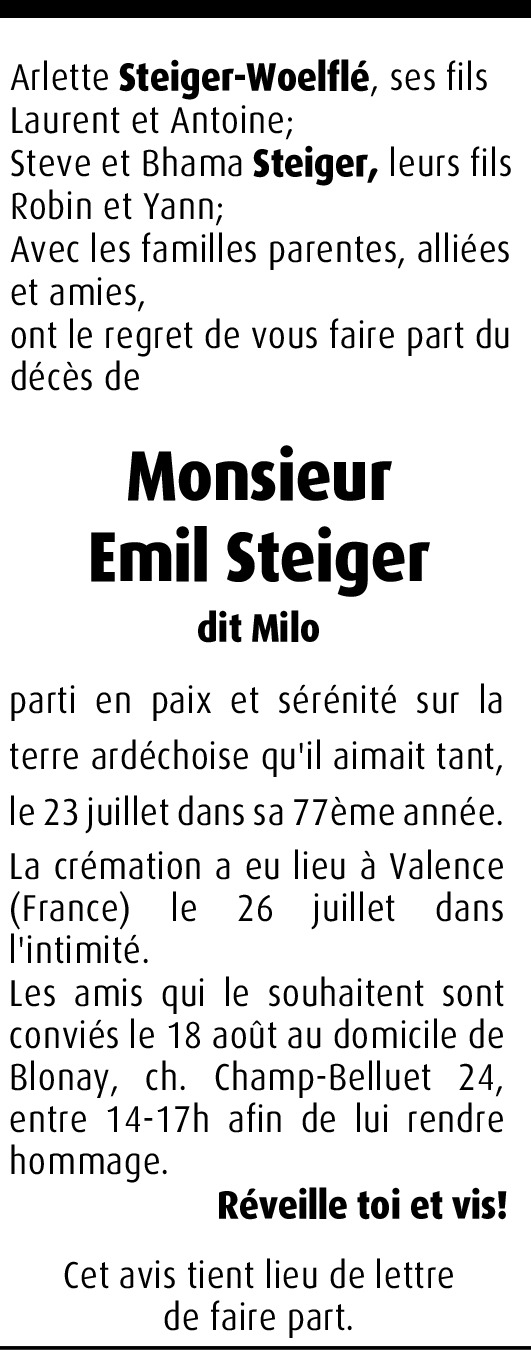 Les contemporains de 1935 de Vevey et environs sont très peinés d'apprendre la disparition de " Milo". Ils garderont un souvenir lumineux de cet ami-contemporains. A tous ses proches nous adressons nos plus sincères condoléances... Le comité et tous les membres de 1935