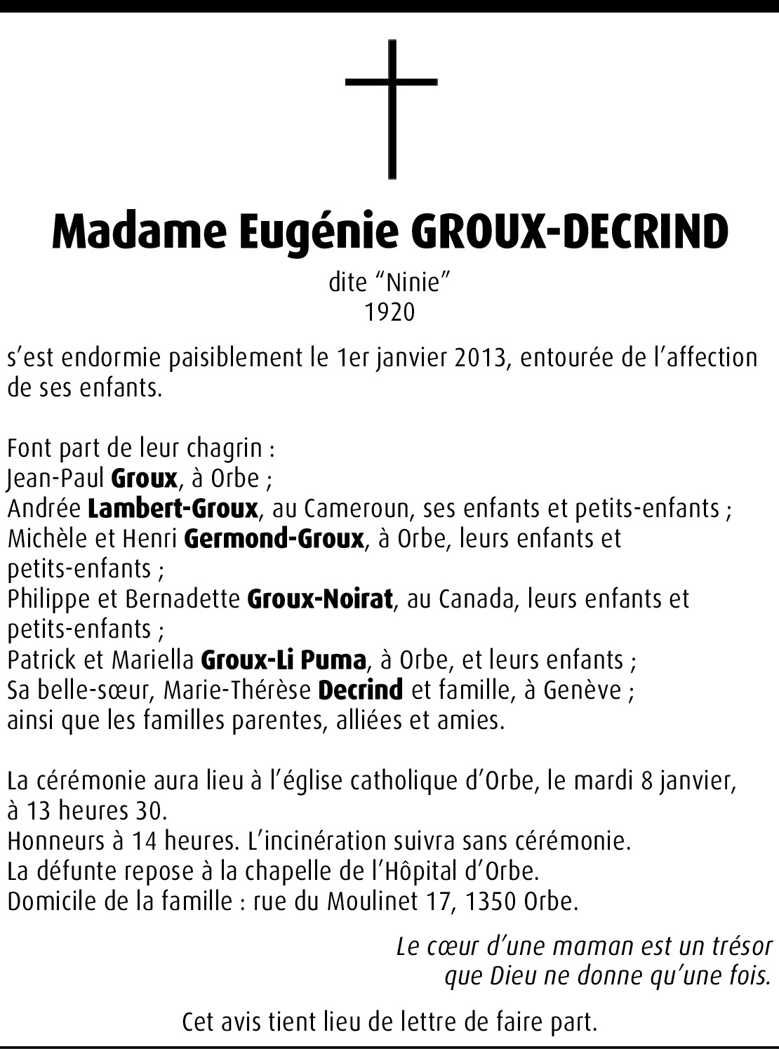 Il y a plus de 4 ans Signaler Recevez, en famille, notre profonde sympathie et nos sincères condoléances. De la part de Marcel et Marlyse Ermini-Desponds
