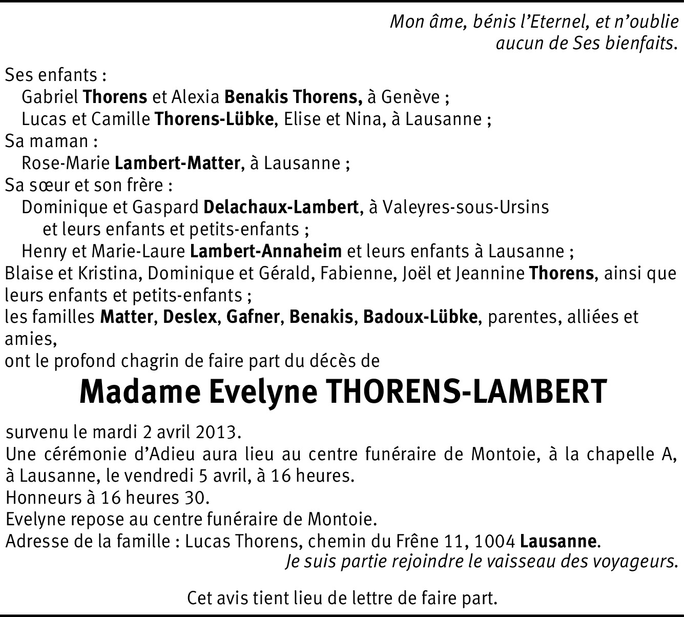 Dear family of dearest Evelyne, We became friends at Schondorf in the spring of 1965 after which I visited Lausanne, and later Basel when Evelyne was there. We lost contact over the years and so I never met Seb or Gabriel and Lucas. We re-established contact via Schondorf in late 2009 and I planned to visit with my family in June 2010 during a trip to Europe from our home in Vancouver, however my father died a few days before our planned flight to Geneva. These last three years have been full of supporting my mother, my disabled daughter, moving house and some medical issues - culminating with the death of my mother on March 20, and her funeral on April 16 2013. During this whole time I have thought so often of Evelyne, wishing her well in her medical challenges, intending to write again and arrange a visit, but never managing to do it. Today at last I took some action, only to find this shocking announcement ... I am so full of regret and sadness to know that she is now gone and we can not meet again. I shall never forget her talent and amazing spirit - I loved her dearly despite my neglect. I send my love and condolences to you all, especially Madame Rose-Marie, Dominique et Henry.