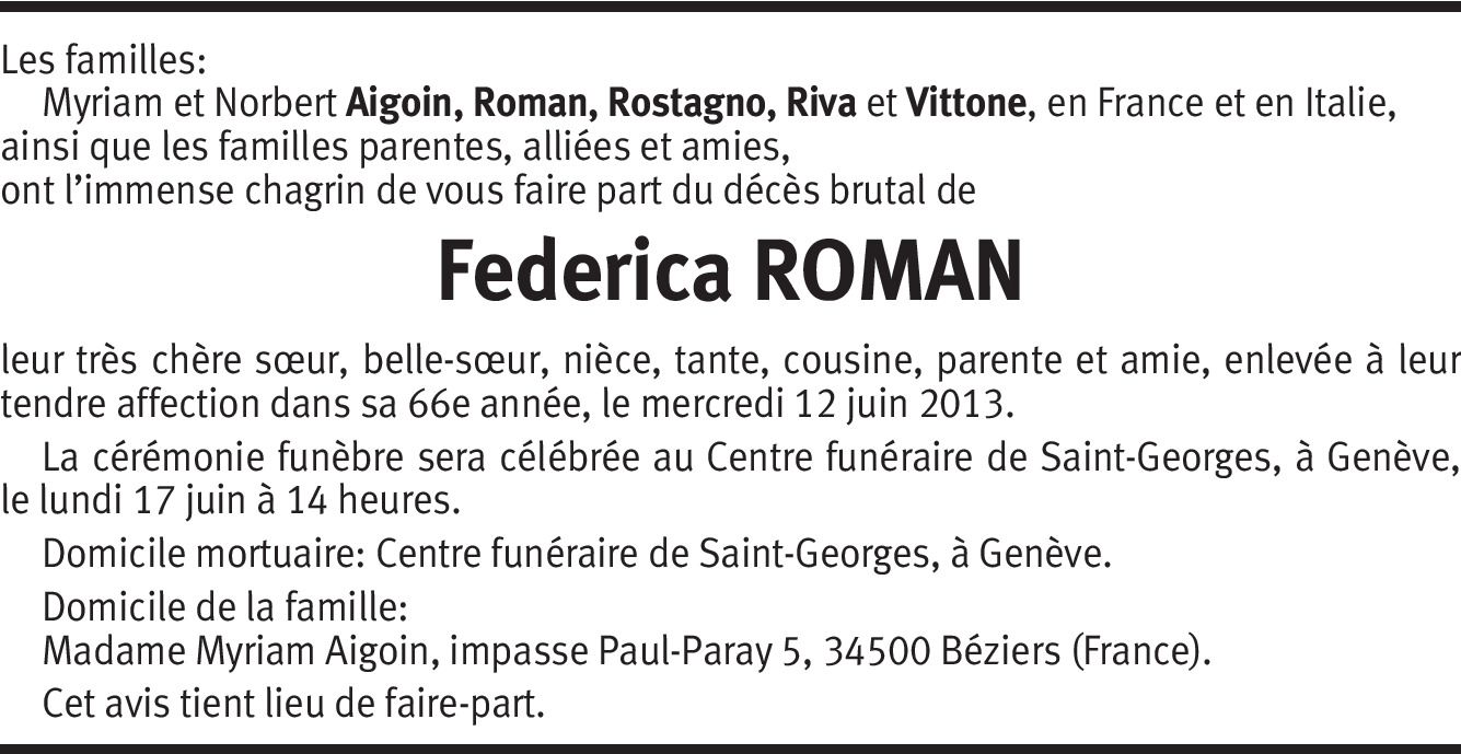Chère Fédérica, Nous nous sommes rencontrées en vacances en 1979 et nous ne nous sommes plus quittées. Merci pour les merveilleux moments que nous avons vécus, les fous rires que nous avons partagés. Tu ne me quitteras jamais car je t’aimerai toujours. Ton amie Jacqueline.