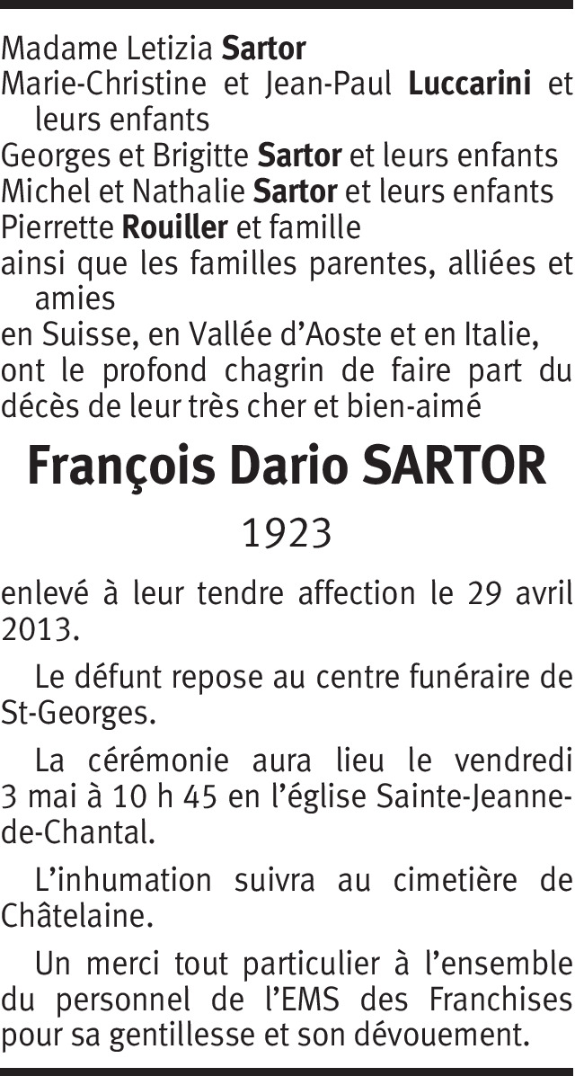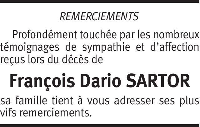 Il y a plus de 4 ans Signaler Chère famille Sartor, recevez en ces moments douloureux toutes mes condoléances et bien des pensées à vous tous. De la part de Chantal Giovenzana