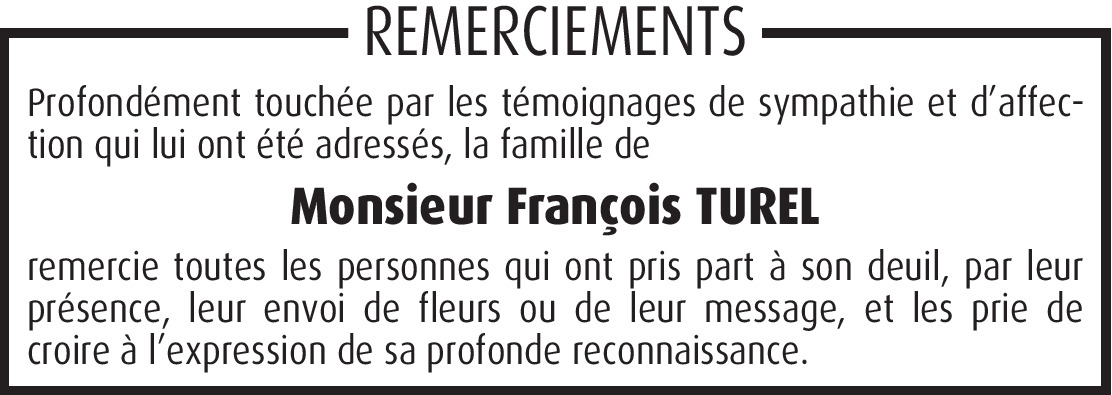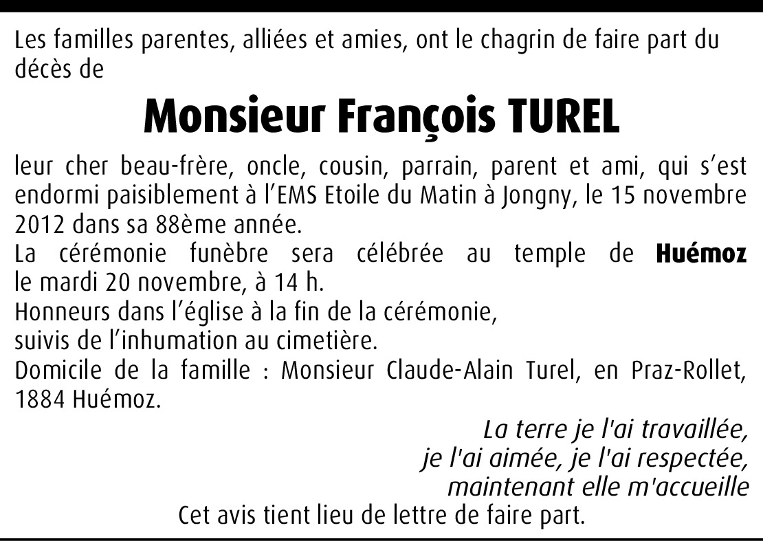 C´est avec grande tristesse que je viens d´apprendre le décès de Francois. Ses parents Henri et Marie Turel-Anex m´ont accueilli dans leur famille pour l'été 1957. Je m´ý plaisait tellement que j´y suis resté jusqu´en 1961.
