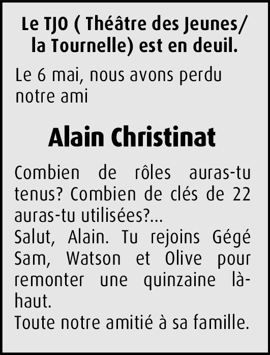 Avec le décalage dû à la distance, j'apprends ton départ, Alain. L'éloignement n'a pas effacé les beaux moments du TJO et des Quinzaines Bon repos, mon ami. Mes pensées émues vont à ta famille.