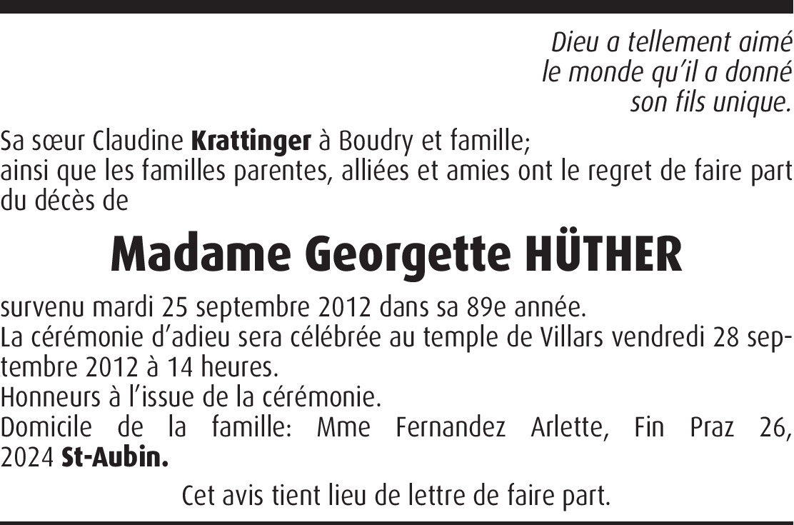 J'ai connu Madame Georgette quand j'ai passé une année (1984-1985) à Villars sur Ollon comme fille au pair chez la famille William et Lida Mayer et leurs enfants Eric et Luc. Eric et Luc allaient à la petite école de Madame Georgette à Chésières. Avec elle, j'ai eu ma première leçon de ski, avec tous les enfants, c'était merveilleux. Je garde un très bon souvenir d'elle. Nous sommes restés en contact plusieurs années après mon départ. Elle m'a aussi beaucoup appris, sur la nature, avec les enfants, etc. Je suis désolée d'apprendre (par hasard) le décès de Madame Georgette et je souhaite à la famille beaucoup de courage. Madame Georgette reste dans mon coeur avec un grand respect. Sincérement Corinne Burgman-Jonkman, Zwolle, Pays-Bas