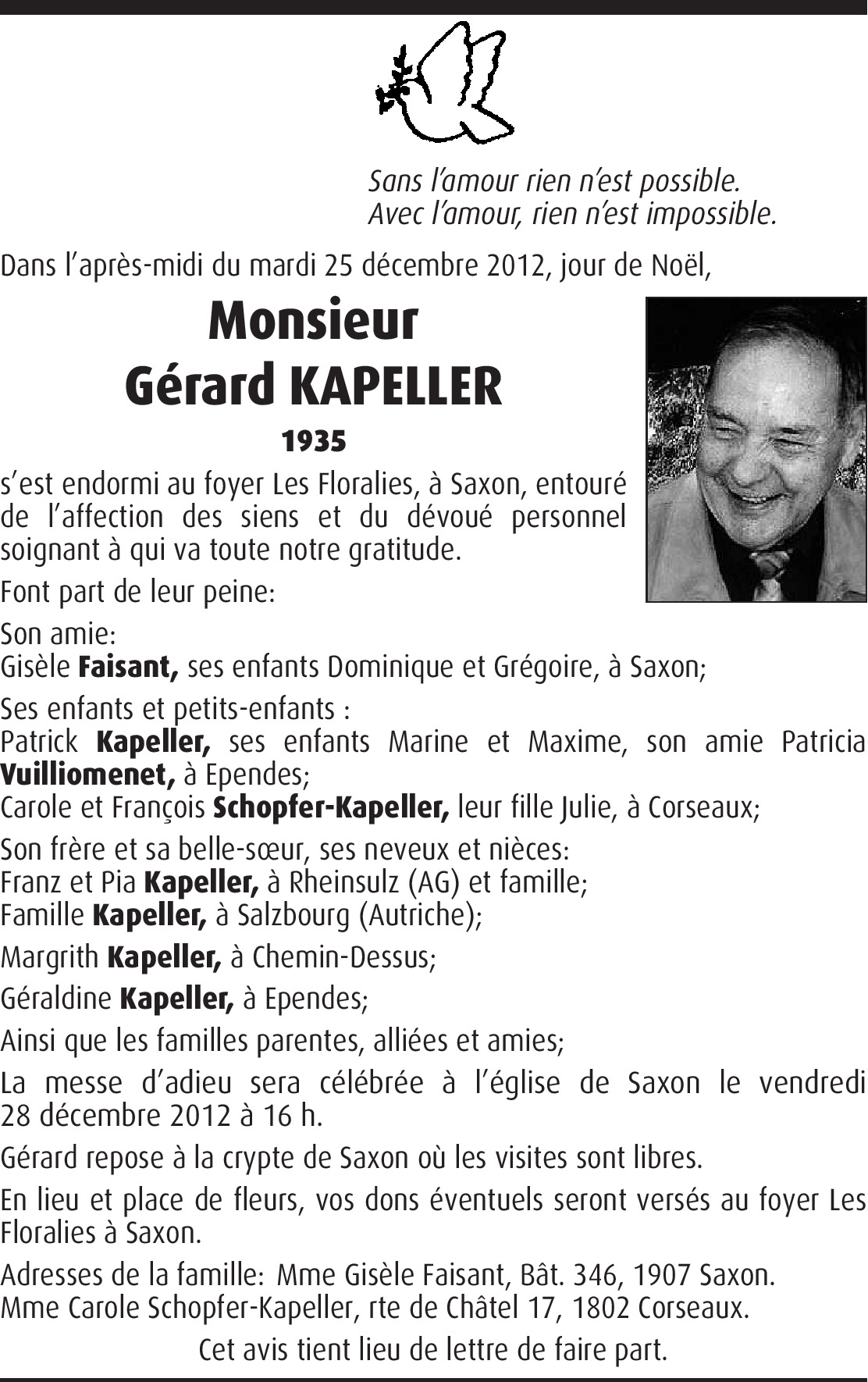 Avons connu Gérard lors de notre arrivée à Yverdon en 1963 à la rue de Montagny et avons sympathisé de nombreuses années. Nous garderons un très beau souvenir de cet homme sympathique et jovial. Nous présentons à toute sa famille nos plus sincères condoléances et leur exprimons notre sympathie.