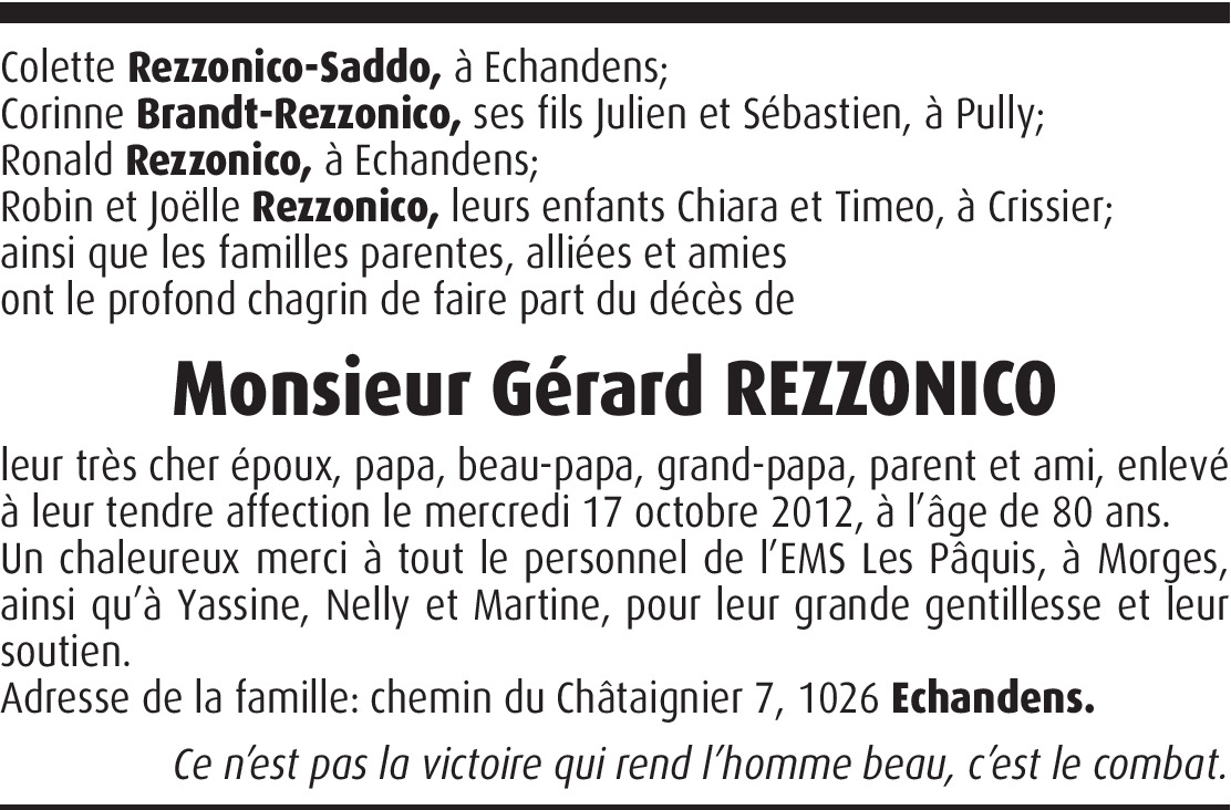 Il y a plus de 4 ans Signaler Bonjour, si ce Gérard Rezznico a été élevé à Méré Montfort l'Amaury, je vous présente toutes mes condoléances en souvenir d'une amitié de jeunesse. Cordialement, Léa De la part de Léa Martin Daszkiewicz