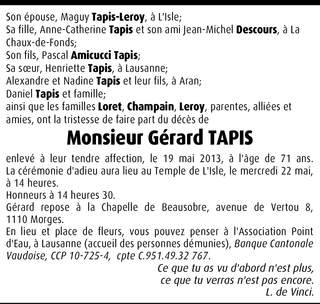 Il y a plus de 4 ans Signaler Toute notre tristesse vous accompagne pour le dépars de Gérard, notre amis, Famille J-C Bösiger. De la part de Jean-Claude Bösiger