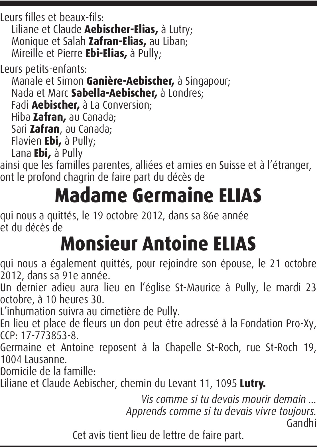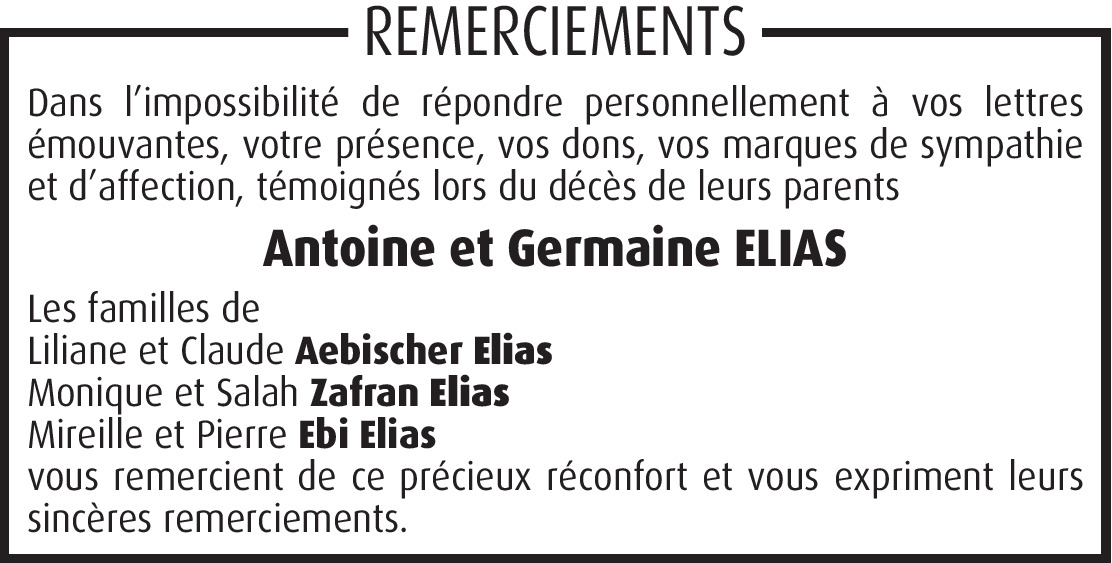 Chère Mireille, Je viens de rentrer de voyage et d'apprendre avec grande tristesse la disparition de vos parents la semaine passée. J'ai toujours eu énormément d'affection et d'admiration pour votre père, qui avec son extrême gentillesse et intelligence, a réussi a m'enseigner une matière qui m'était tout sauf agréable; les maths. Je n'aurais jamais pensé que me rendre à mon cours de maths serait un tel plaisir, et cela est entièrement dû a l'accueil chaleureux que je recevais de votre père ainsi que de votre mère. Je me souviens avec beaucoup d'émotion lorsque j'ai présenté vos parents à mon grand-père égyptien, lors d'un dîner chez mes parents. Il y a eu une entente immédiate, comme une évidence. Ils faisaient partie de cette génération extraordinaire, venue du Moyen-Orient, qui vécurent l'exil et le refuge en Suisse. Malgré ce passé difficile, ils ont toujours su maintenir cette bonté qui les rendait si uniques. J'ai moi-même perdu mon grand-père cet été, à 93 ans, et suis très attristée de voir cette génération disparaître. Antoine parlait avec beaucoup de fierté de ses enfants et petits-enfants. Je n'ai eu la chance que de vous rencontrer vous Mireille, mais je tenais vraiment à tous vous transmettre mes condoléances les plus sincères. Je garderai toujours un souvenir ému de vos parents. Avec toute ma sympathie, Alexandra Schinasi PS: J'ai essaye d'envoyer le mail a l'adresse e-mail de Mireille.. Mais il n'a pas passé!