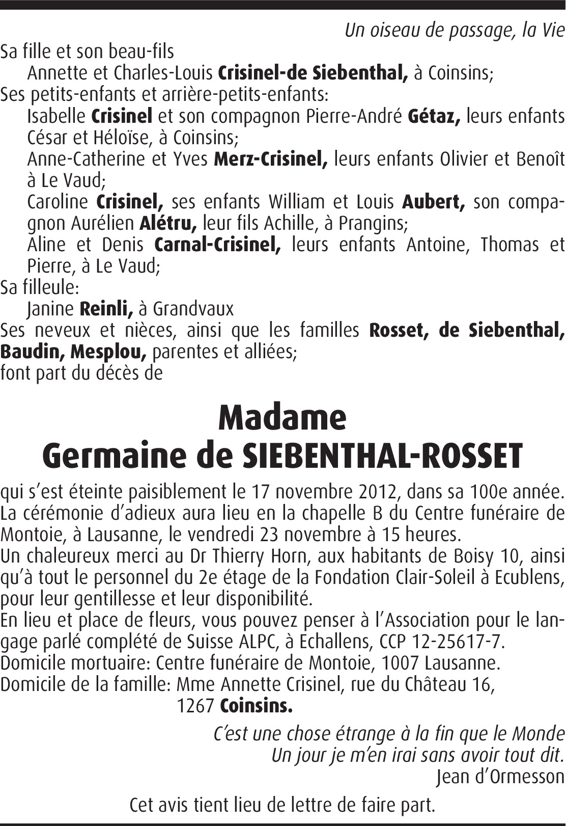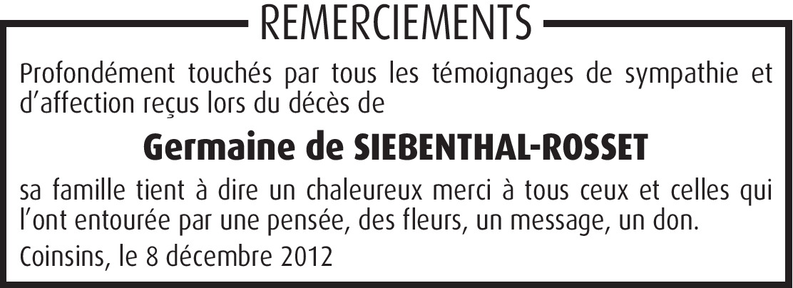 Nous venons d'apprendre le décès de tante Germaine. Nous gardons un souvenir ému de cette grande amie notamment de la musique classique. Toutes nos condoléances à toute la famille. Ayant passé par cette épreuve récemment, nous comprenons votre douleur. François, Cecilia de Siebenthal et leurs enfants +. RIP
