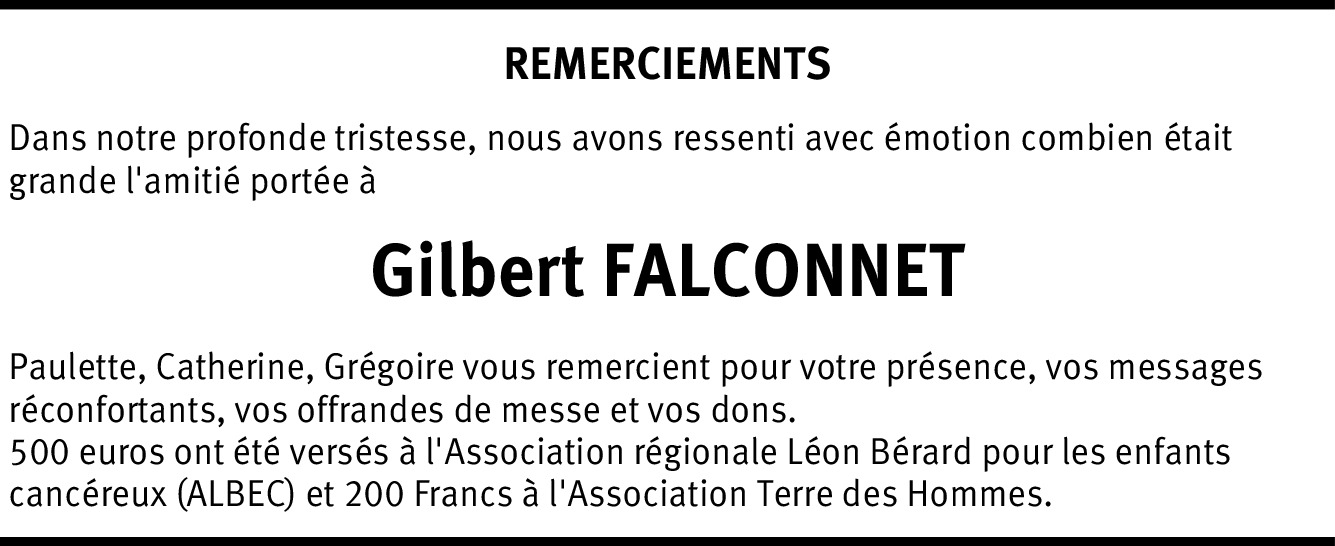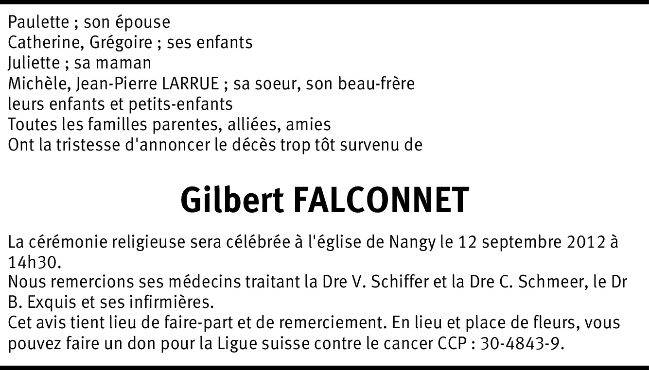 Nous vous présentons nos sincères condoléances et vous souhaitons beaucoup de courage en ces instants si pénibles de la séparation d'avec un être cher. R. et S. Flotron, Onex.