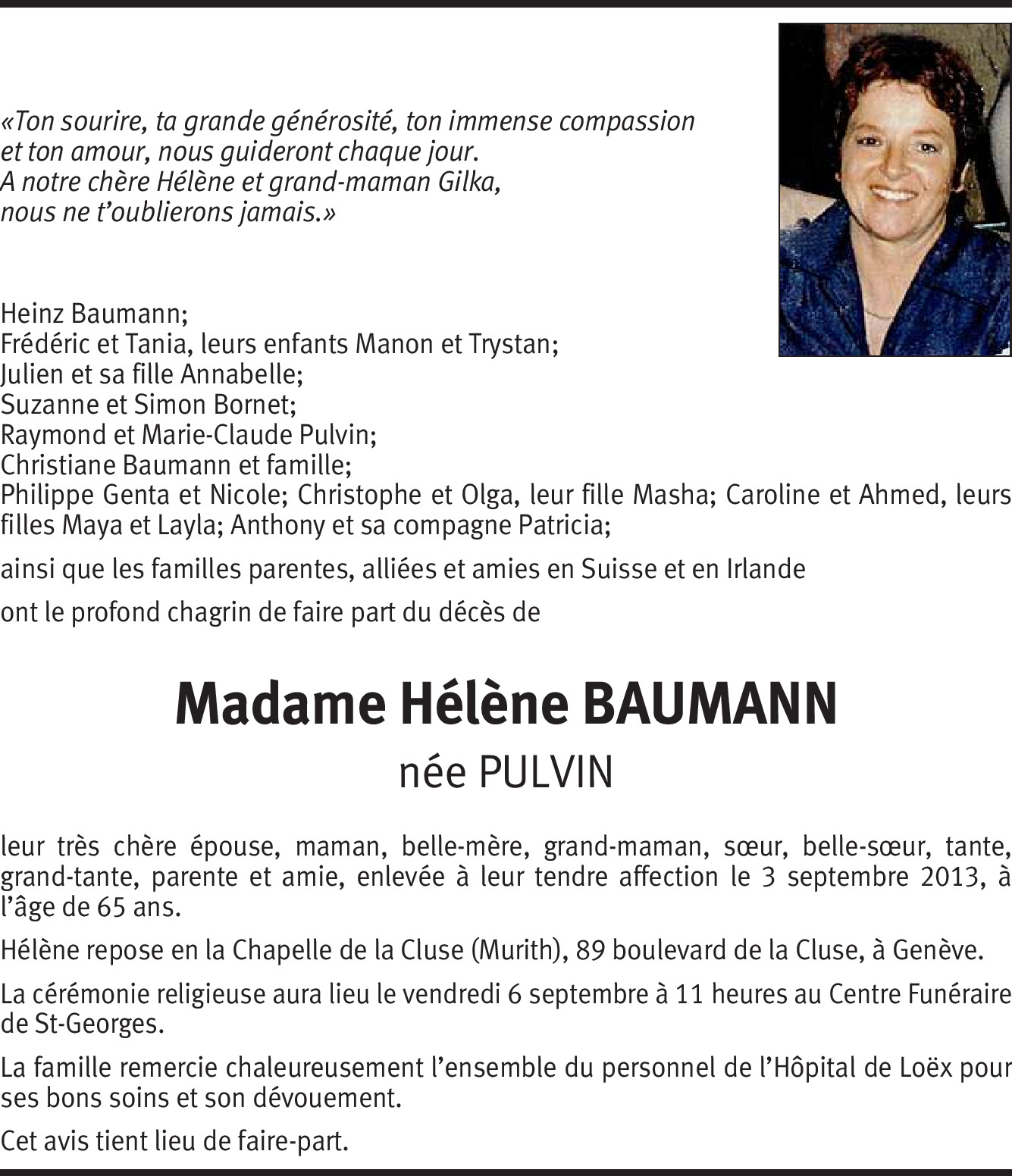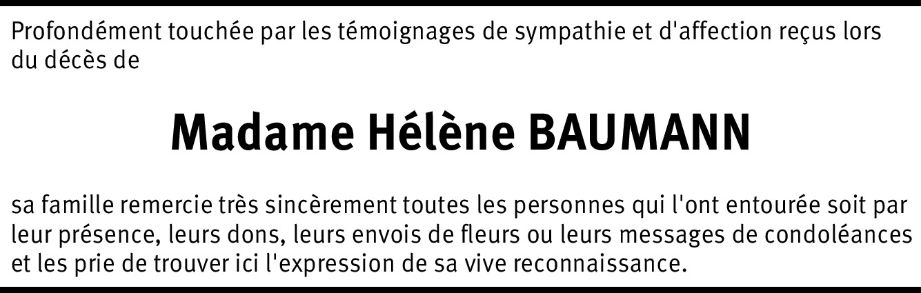 C'est avec une profonde tristesse que j'ai appris la disparition d'Hélène. Etant à l'étranger, j'ai infiniment regretté de ne pas avoir pu assister à son service funèbre et de témoigner de mon soutien à la famille en ces moments difficiles et infiniment tristes. Puisse la fin des souffrance d'Hélène calmer votre douleur et de vous faire recouvrer la sérénité.