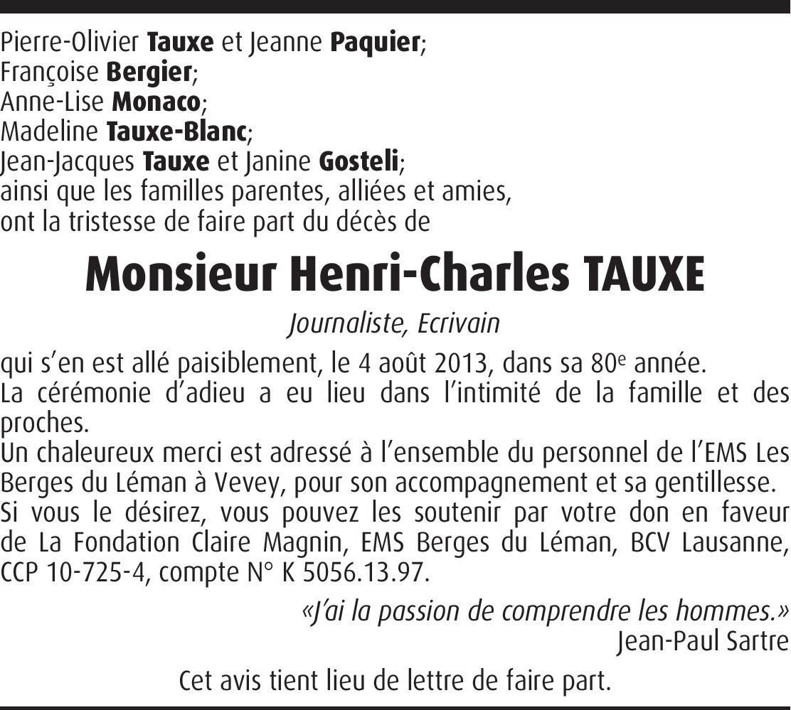 La Ville de Vevey rend hommage à la mémoire de M. Henri-Charles Tauxe, ancien journaliste et philosophe. Il avait choisi notre ville pour y vivre sa retraite. Son intérêt pour la chose publique ne s'est pas démentie et il a continué à apporter sa vision sur le monde qui l'entourait.