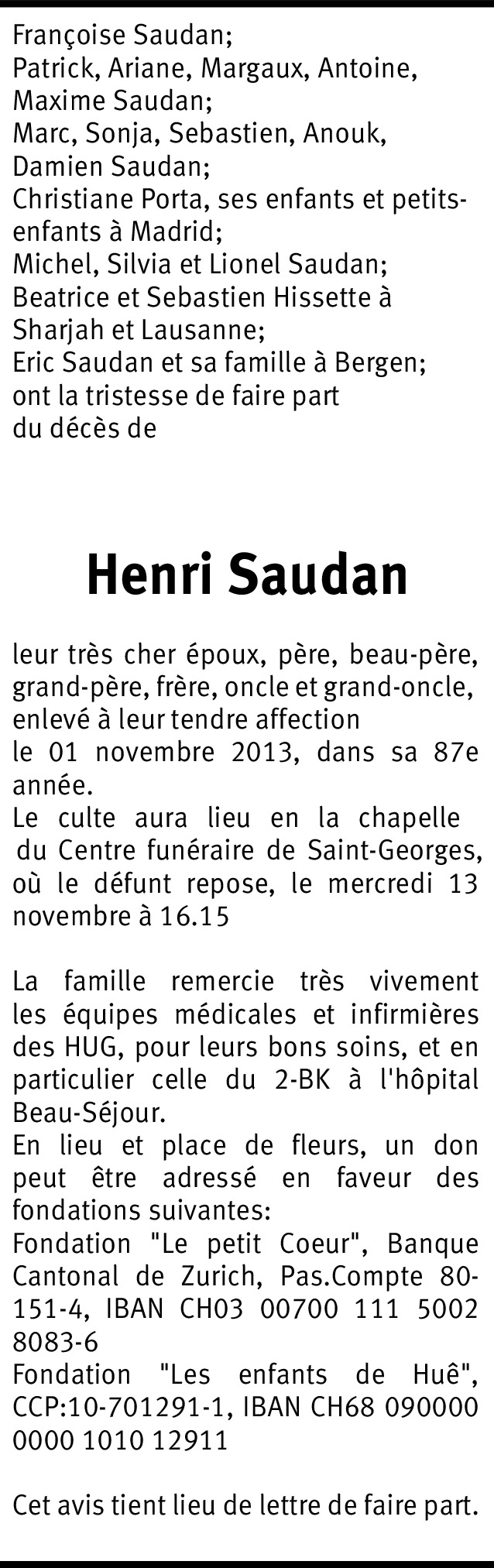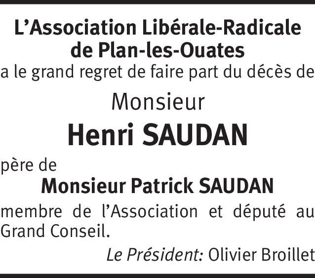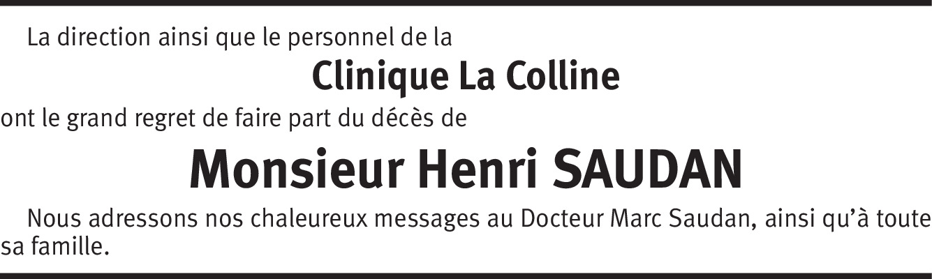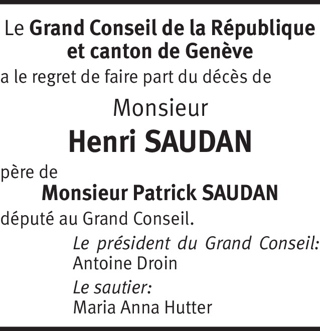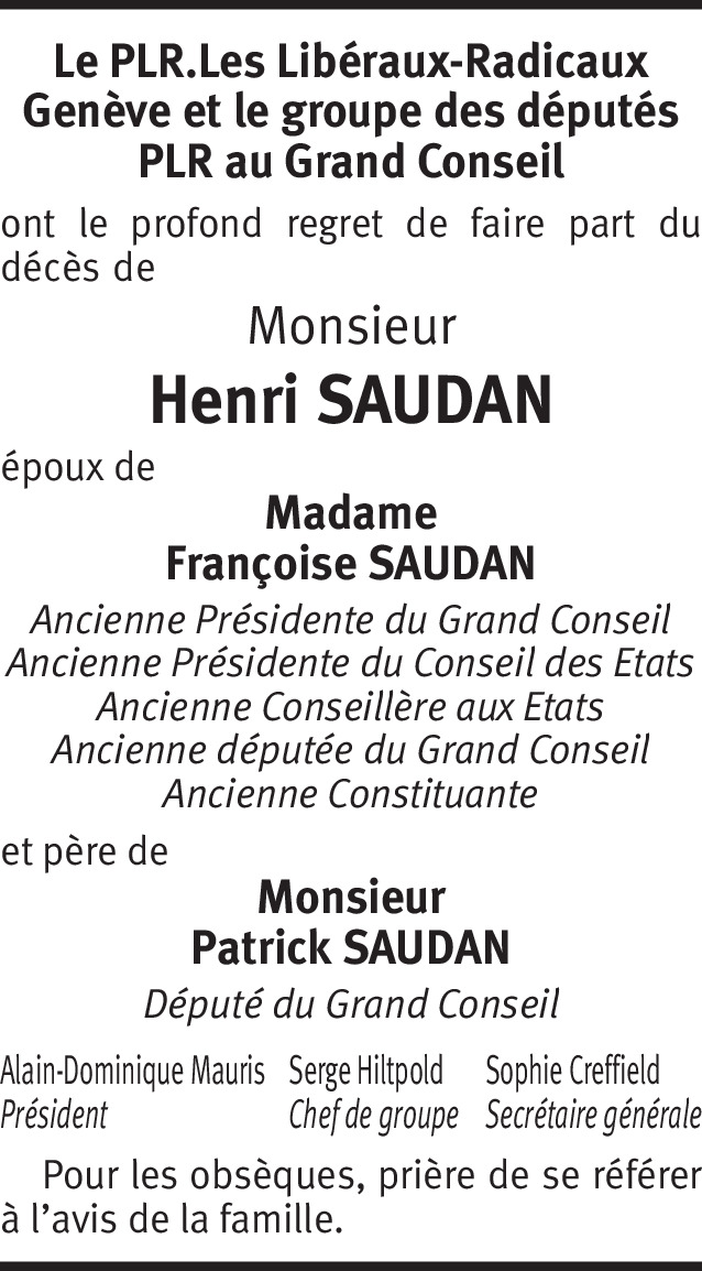 Il y a plus de 4 ans Signaler Mes condoléances attristées vont vers Mme Françoise Saudan, ses fils Messrs. Patrick et Marc Saudan, leurs épouses ainsi que ses petits enfants. Pensées amicales à tous. De la part de Catherine Balazuc Taylor