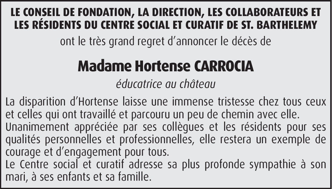 Madame Hortence CARROCIA Notre soeur en Jésus-Christ Les familles Girard, Mangin, de Haumont, Roussel, Blatti, Zimmermann, l'église évangélique le Semeur de Colmar (France), les frères et soeurs en Christ du groupe de prière ressentent une très grande tristesse suite au décès de notre soeur. Luttant admirablement face à la maladie, elle repose en Paix auprès de l'Eternel notre Dieu. Nous ne t'oublierons pas! Nous vous adressons nos plus sincères et profondes condoléances à ses 2 petites filles et son mari ainsi que notre plus grande sympathie. Les frères et soeurs en Christ de Colmar. Jean-Marie Zimmermann.