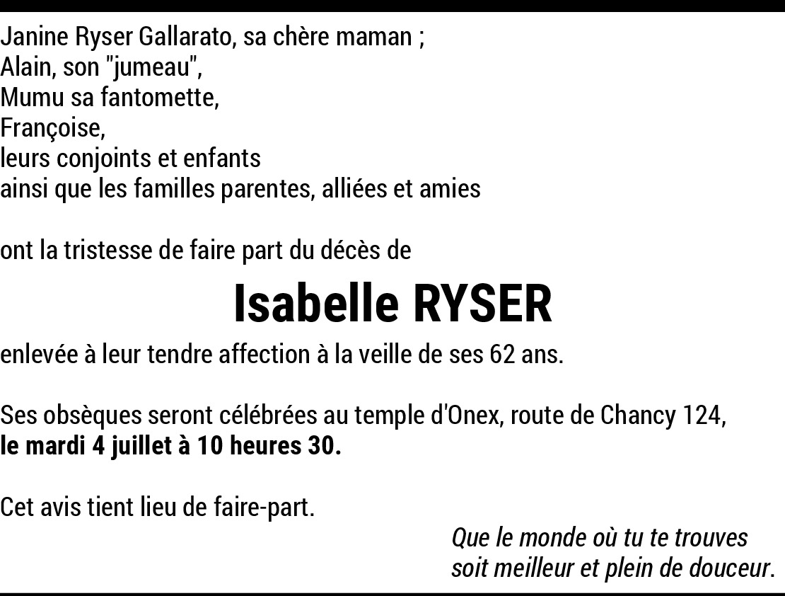 En grande pensée avec toute la famille dans ces moments si difficiles! Recevez mes sincères condoléances pour le décès d'Isabelle. Avec toute mon amitié.
